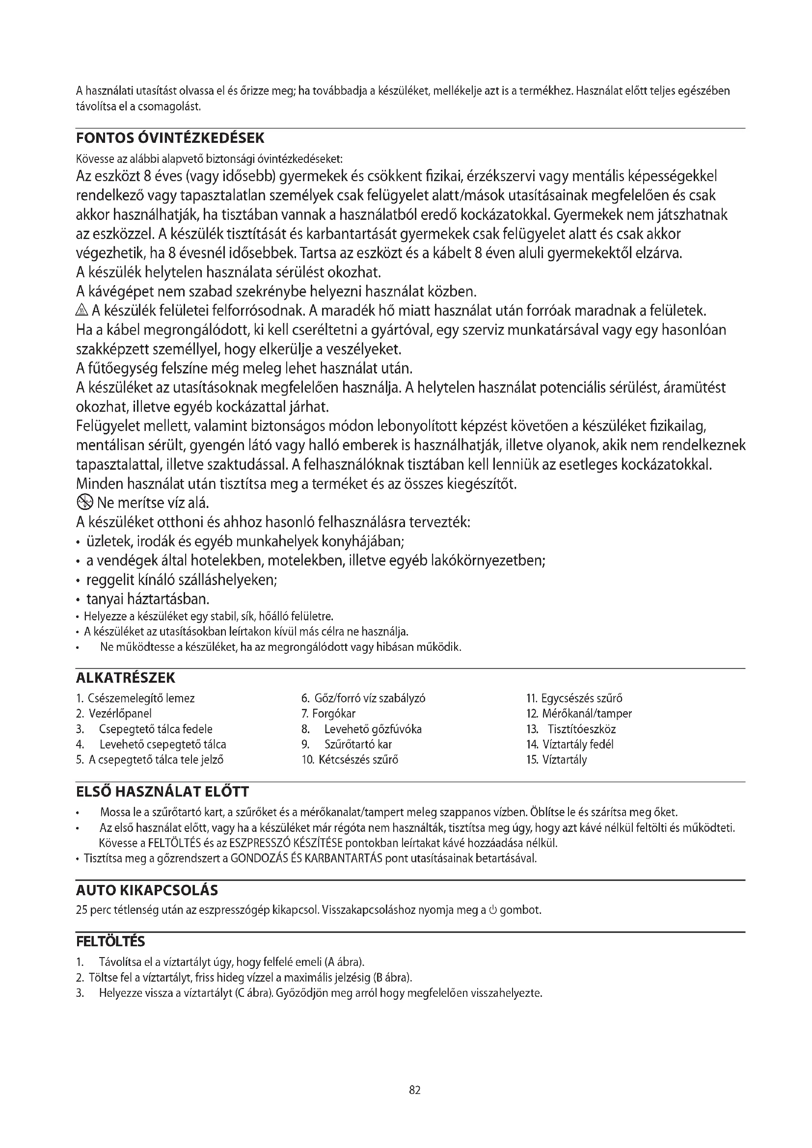 Kövesse az alábbi alapvető biztonsági óvintézkedéseket: Az eszközt 8 éves (vagy idősebb) gyermekek és csökkent fizikai, érzékszervi vagy mentális képességekkel rendelkező vagy tapasztalatlan személyek csak felügyelet alatt/mások utasításainak megfelelően és csak akkor használhatják, ha tisztában vannak a használatból eredő kockázatokkal. Gyermekek nem játszhatnak az eszközzel. A készülék tisztítását és karbantartását gyermekek csak felügyelet alatt és csak akkor végezhetik, ha 8 évesnél idősebbek. Tartsa az eszközt és a kábelt 8 éven aluli gyermekektől elzárva. A készülék helytelen használata sérülést okozhat. A kávégépet nem szabad szekrénybe helyezni használat közben. h A készülék felületei felforrósodnak. A maradék hő miatt használat után forróak maradnak a felületek. Ha a kábel megrongálódott, ki kell cseréltetni a gyártóval, egy szerviz munkatársával vagy egy hasonlóan szakképzett személlyel, hogy elkerülje a veszélyeket. A fűtőegység felszíne még meleg lehet használat után. A készüléket az utasításoknak megfelelően használja. A helytelen használat potenciális sérülést, áramütést okozhat, illetve egyéb kockázattal járhat. Felügyelet mellett, valamint biztonságos módon lebonyolított képzést követően a készüléket fizikailag, mentálisan sérült, gyengén látó vagy halló emberek is használhatják, illetve olyanok, akik nem rendelkeznek tapasztalattal, illetve szaktudással. A felhasználóknak tisztában kell lenniük az esetleges kockázatokkal. Minden használat után tisztítsa meg a terméket és az összes kiegészítőt.
