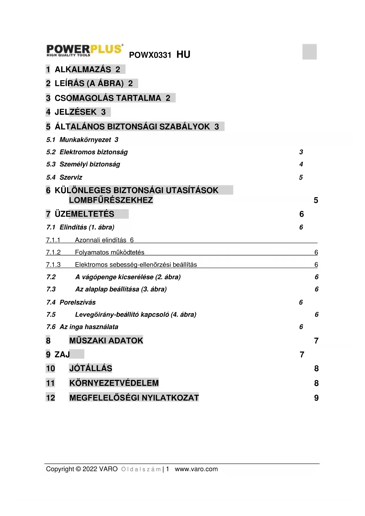 Ha a gép elhasználódott, ne dobja a háztartási szemétbe, hanem gondoskodjon annak környezetbarát elhelyezéséről! Az elhasználódott elektromos termékek hulladékait ne dobja a háztartási szemétbe. Kérjük, hogy gondoskodjon azok újrahasznosításáról, amennyiben erre lehetősége van. Az újrahasznosítási lehetőségeket illetően érdeklődjön a helyi köztisztasági szerveknél vagy a forgalmazónál!POWX0331 HU Copyright © 2022 VARO O l d a l s z á m | 9 www.varo.com