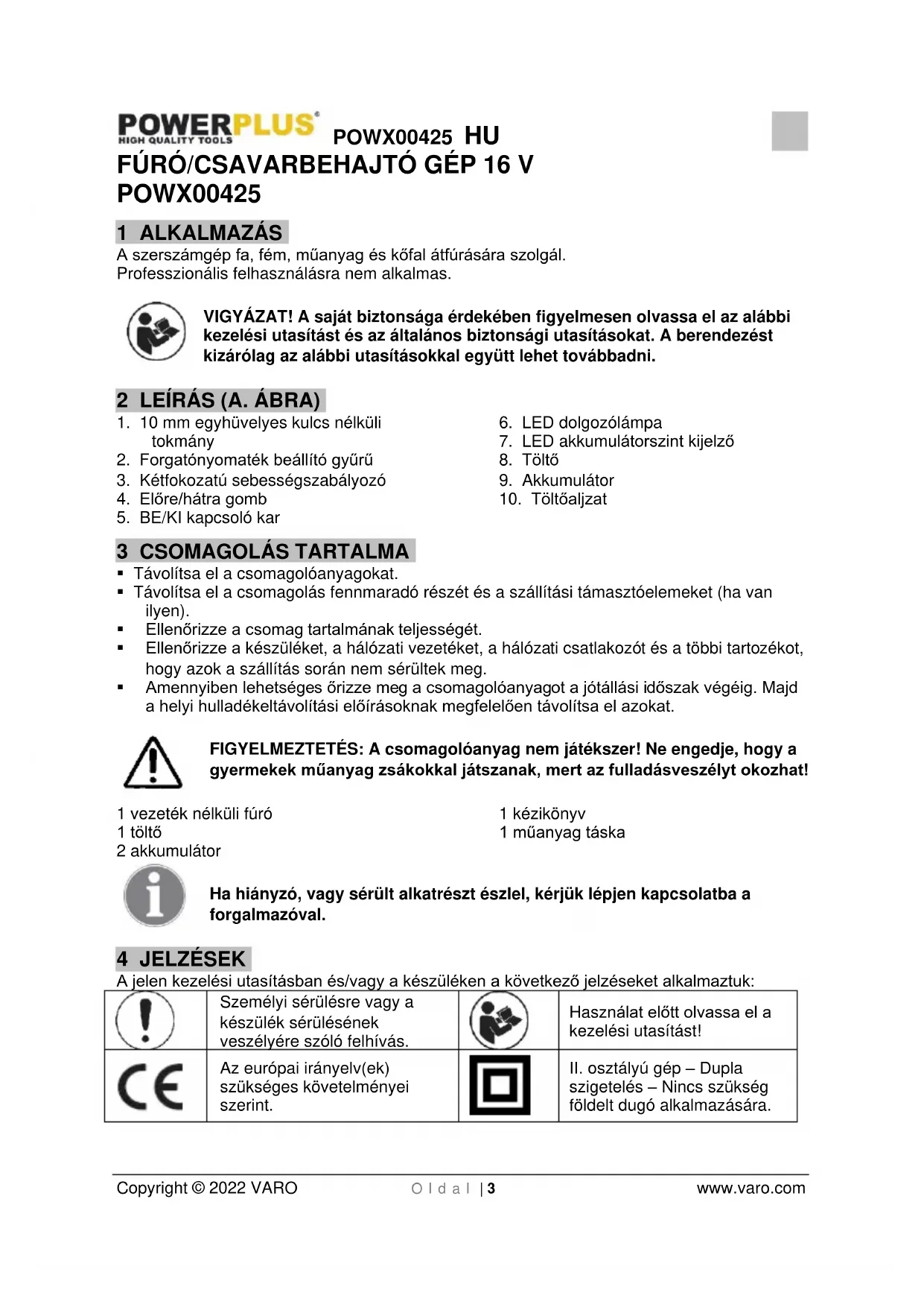 - VARO N.V. - Vic. Van Rompuy N.V.- Joseph Van Instraat 9 - BE2500 Lier - BELGIUM, kijelenti, hogy A termék típusa: Fúró/Csavarbehajtó Gép Márkanév: POWERplus Cikkszám: POWX00425 megfelel a harmonizált európai szabványok alkalmazásán alapuló, idevonatkozó európai irányelvek alapvető követelményeinek és egyéb vonatkozó rendelkezéseinek. A készülék bármilyen illetéktelen módosítása érvényteleníti a jelen nyilatkozatot. Európai irányelvek (ideértve, adott esetben, azok módosításait az aláírás időpontjáig): 2014/30/EU 2006/42/EK 2011/65/EU Harmonizált európai szabványok (ideértve, adott esetben, azok módosításait az aláírás időpontjáig): EN62841-1 : 2015 EN62841-2-1 : 2018 EN55014-1 : 2017 EN55014-2 : 2015 A műszaki dokumentáció birtokosa: Philippe Vankerkhove, VARO - Vic. Van Rompuy N.V. Az alulírott a társaság vezérigazgatója nevében jár el, Ludo Mertens Szabályozási Ügyek - Megfelelőségi Menedzser 22/12/2021, Lier - BelgiumPOWX00425 RU Copyright © 2022 VARO С т р . | 1 www.varo.com 1 ОБЛАСТЬ ПРИМЕНЕНИЯ p. 3
