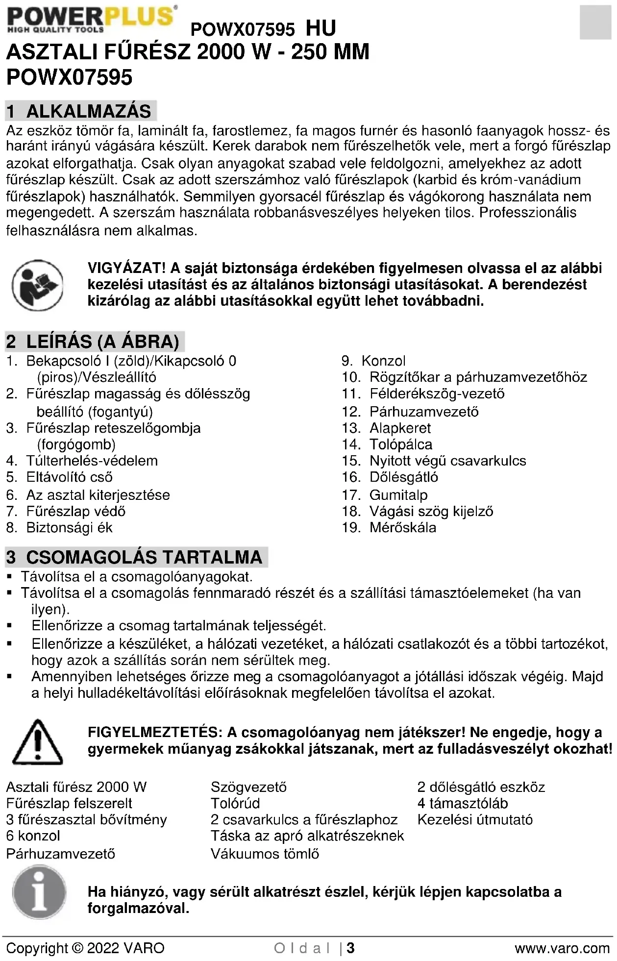 - Amennyiben lehetséges őrizze meg a csomagolóanyagot a jótállási időszak végéig. Majd a helyi hulladékeltávolítási előírásoknak megfelelően távolítsa el azokat. FIGYELMEZTETÉS: A csomagolóanyag nem játékszer! Ne engedje, hogy a gyermekek műanyag zsákokkal játszanak, mert az fulladásveszélyt okozhat! Asztali fűrész 2000 W Fűrészlap felszerelt 3 fűrészasztal bővítmény 6 konzol Párhuzamvezető Szögvezető Tolórúd 2 csavarkulcs a fűrészlaphoz Táska az apró alkatrészeknek Vákuumos tömlő 2 dőlésgátló eszköz 4 támasztóláb Kezelési útmutató Ha hiányzó, vagy sérült alkatrészt észlel, kérjük lépjen kapcsolatba a forgalmazóval.POWX07595 HU Copyright © 2022 VARO O l d a l | 4 www.varo.com 4 KIEGÉSZÍTŐ BIZTONSÁGI UTASÍTÁSOK