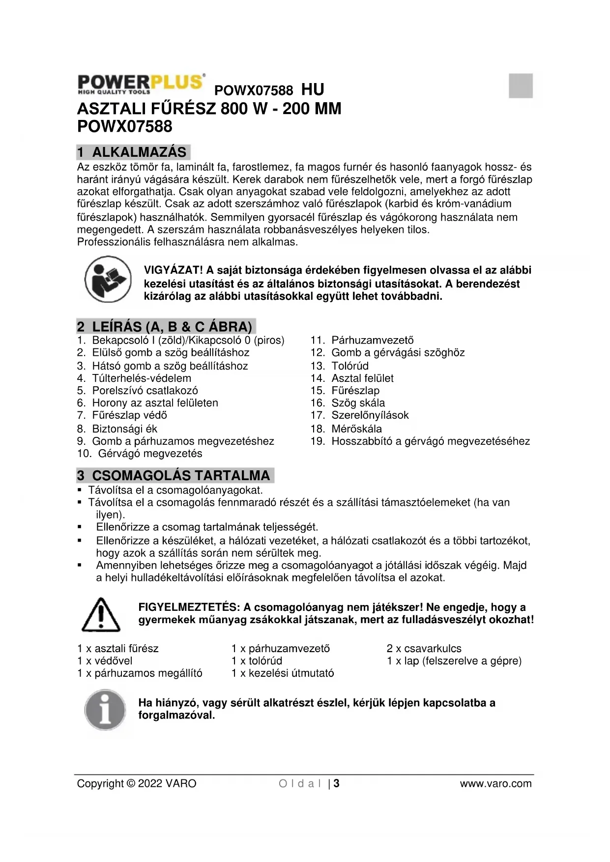 Copyright © 2022 VARO O l d a l | 3 www.varo.com ASZTALI FŰRÉSZ 800 W - 200 MM POWX07588 1 ALKALMAZÁS Az eszköz tömör fa, laminált fa, farostlemez, fa magos furnér és hasonló faanyagok hossz- és haránt irányú vágására készült. Kerek darabok nem fűrészelhetők vele, mert a forgó fűrészlap azokat elforgathatja. Csak olyan anyagokat szabad vele feldolgozni, amelyekhez az adott fűrészlap készült. Csak az adott szerszámhoz való fűrészlapok (karbid és króm-vanádium fűrészlapok) használhatók. Semmilyen gyorsacél fűrészlap és vágókorong használata nem megengedett. A szerszám használata robbanásveszélyes helyeken tilos. Professzionális felhasználásra nem alkalmas. VIGYÁZAT! A saját biztonsága érdekében figyelmesen olvassa el az alábbi kezelési utasítást és az általános biztonsági utasításokat. A berendezést kizárólag az alábbi utasításokkal együtt lehet továbbadni. 2 LEÍRÁS (A, B & C ÁBRA)