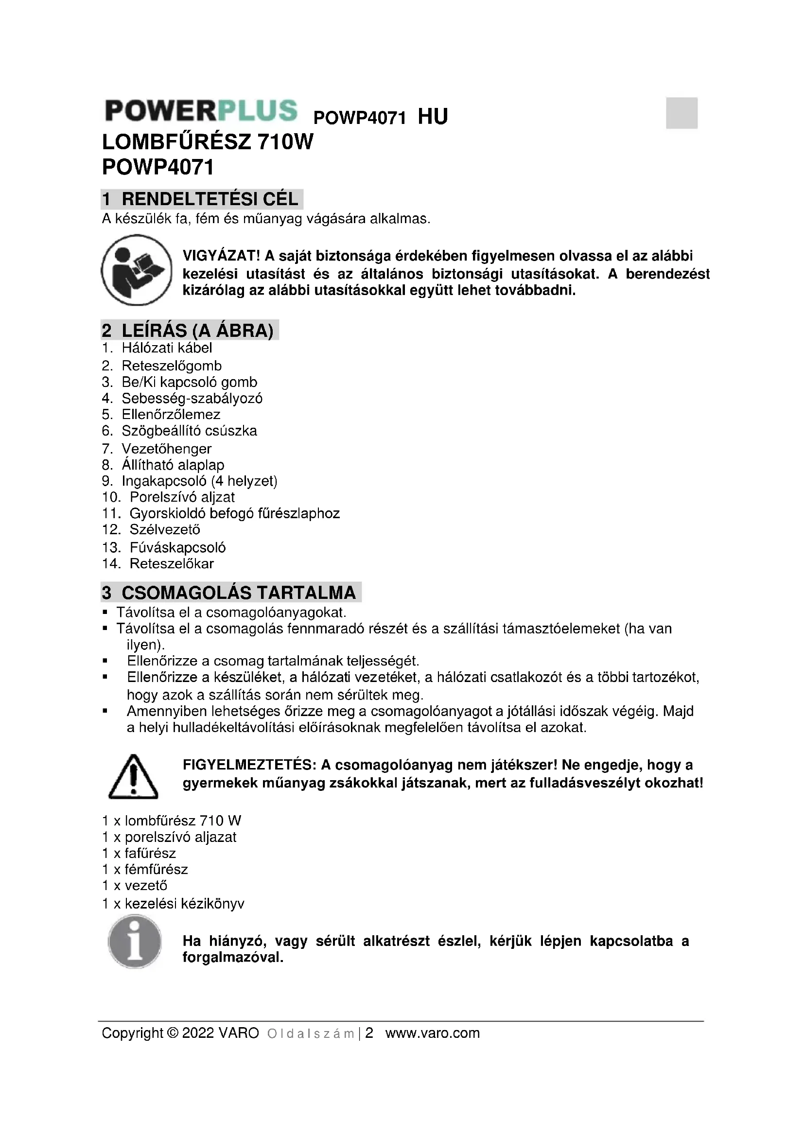 - Tartsa élesen és tisztán a vágószerszámokat. A helyesen karbantartott, éles vágószerszámok kevésbé akadnak el és könnyebben irányíthatók.POWP4071 HU Copyright © 2022 VARO O l d a l s z á m | 5 www.varo.com