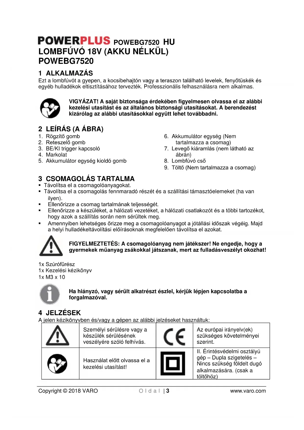 gép – Dupla szigetelés – Nincs szükség földelt dugó alkalmazására. (csak a töltőhöz)POWEBG7520 HU Copyright © 2018 VARO O l d a l | 4 www.varo.com
