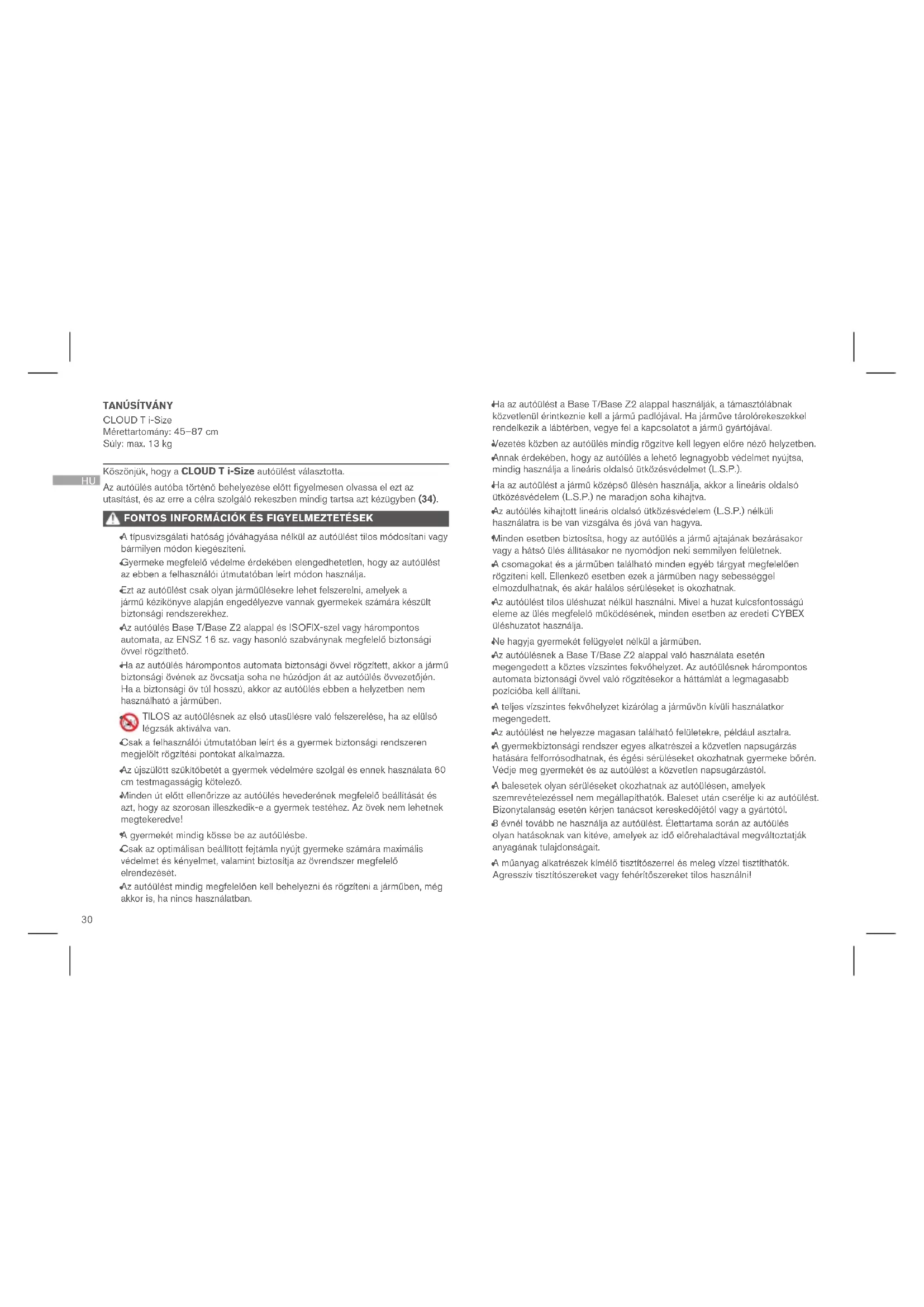 Köszönjük, hogy a CLOUD T i-Size autóülést választotta. Az autóülés autóba történő behelyezése előtt figyelmesen olvassa el ezt az utasítást, és az erre a célra szolgáló rekeszben mindig tartsa azt kézügyben (34). FONTOS INFORMÁCIÓK ÉS FIGYELMEZTETÉSEK