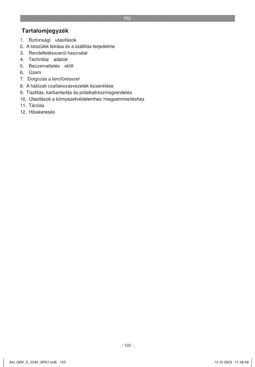 Veszély! A hibakeresés előtt kikapcsolni és kihúzni a hálózati csatlakozót. A következő táblázat felmutatja a hibaszimptómákat és leírja hogy hogyan lehet őket elhárítani, ha a gép egyszer nem működne helyesen. Ha ezzel nem tudja lokalizálni és megoldani a problémát, akkor kérjük forduljon a szervíz-műhelyéhez. Ok Hiba Elhárítás A láncfűrész nem működik rendesen - Ki van oldva a visszacsapódási fék - Nincs áramellátás - Defekt a dugaszoló aljzat - Megrongálódva az áramhosszab- bítókábel - Defekt a biztosíték - Visszahúzni a kézvédőt a pozcióba - Leellenőrizni az áramellátást - Kipróbálni más áramforrást, adott esetben cserélni - Leellenőrizni a kábelt, adott eset- ben kicserélni - Biztosítékot kicserélni A láncfűrész kiha- gyásosan dolgozik - Áramkábel megrongálódva - Externi laza érintkező - Interni laza érintkező - Defekt a be- / kikapcsoló - Felkeresni a szakműhelyet - Felkeresni a szakműhelyet - Felkeresni a szakműhelyet - Felkeresni a szakműhelyet Száraz a fűrészlánc - Nincs olaj a tartályban - El van dugulva a szellőzetető az olajtartályzárban - Edugulva az olajkifolyó kanális - Olajat utántöleni - Megtisztítani aolajtartályzárat - Szabaddá tenni az olajkifolyó kaná- list Nem működik a láncfűrész - Probléma a kapcsolómechaniz- mussal az elülső kézvédőben. - Felkeresni a szakműhelyet Forró a lánc/ vezetősín - Nincs olaj a tartályban - El van dugulva a szellőzetető az olajtartályzárban - Edugulva az olajkifolyó kanális - Tompa a lánc - Olajat utántöleni - Megtisztítani az olajtartályzárat - Szabaddá tenni az olajkifolyó kaná- list - Utánnacsiszolni vagy kicserélni a láncot A láncfűrész té- pdes, vibrál vagy nem fű részel ren- desen - Túl laza a láncfeszesség - Tompa a lánc - Elkopott a lánc - Rossz irányba mutatnak a fűrészfogak - Beállítani a láncfeszességet - Utánnacsiszolni vagy kicserélni a láncot - Kicserélni a láncot - Újra felszerelni a helyes irányban levő fogakkal Anl_GEK_E_2240_SPK7.indb 131Anl_GEK_E_2240_SPK7.indb 131 13.10.2023 11:48:5113.10.2023 11:48:51HU