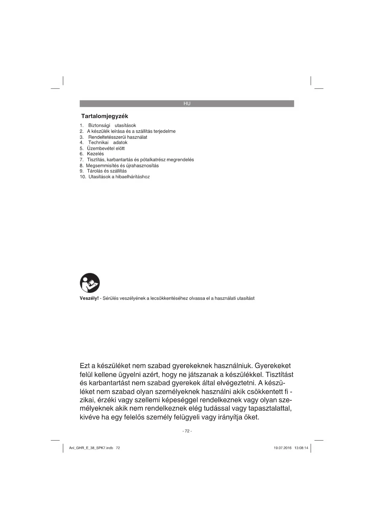 Ezt a készüléket nem szabad gyerekeknek használniuk. Gyerekeket felül kellene ügyelni azért, hogy ne játszanak a készülékkel. Tisztítást és karbantartást nem szabad gyerekek által elvégeztetni. A készü- léket nem szabad olyan személyeknek használni akik csökkentett fi - zikai, érzéki vagy szellemi képeséggel rendelkeznek vagy olyan sze- mélyeknek akik nem rendelkeznek elég tudással vagy tapasztalattal, kivéve ha egy felelős személy felügyeli vagy irányítja őket. Veszély! - Sérülés veszélyének a lecsökkentéséhez olvassa el a használati utasítást Anl_GHR_E_38_SPK7.indb 72Anl_GHR_E_38_SPK7.indb 72 19.07.2016 13:08:1419.07.2016 13:08:14HU