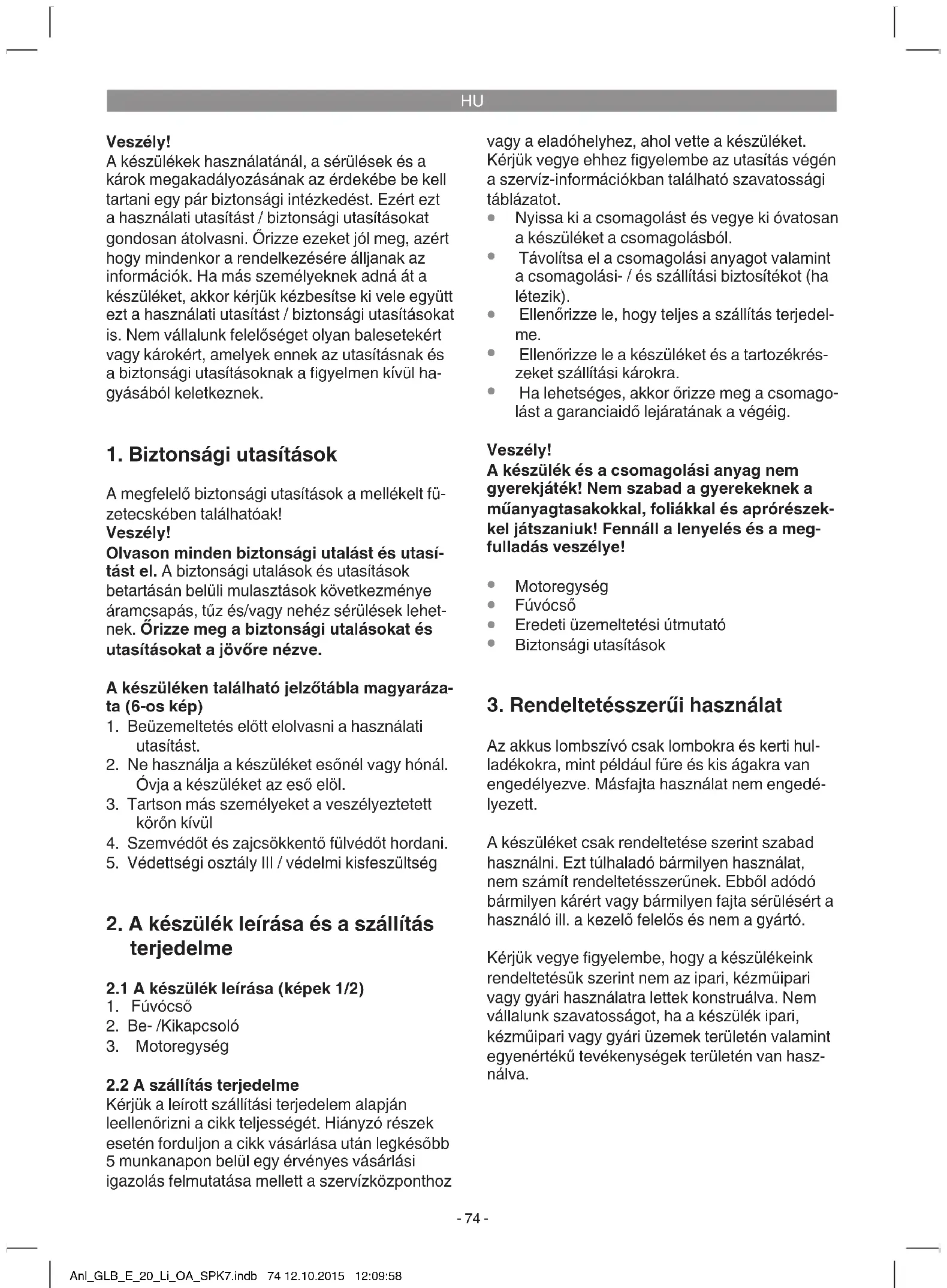 Az akkus lombszívó csak lombokra és kerti hul- ladékokra, mint például fűre és kis ágakra van engedélyezve. Másfajta használat nem engedé- lyezett. A készüléket csak rendeltetése szerint szabad használni. Ezt túlhaladó bármilyen használat, nem számít rendeltetésszerűnek. Ebből adódó bármilyen kárért vagy bármilyen fajta sérülésért a használó ill. a kezelő felelős és nem a gyártó. Kérjük vegye gyelembe, hogy a készülékeink rendeltetésük szerint nem az ipari, kézműipari vagy gyári használatra lettek konstruálva. Nem vállalunk szavatosságot, ha a készülék ipari, kézműipari vagy gyári üzemek területén valamint egyenértékű tevékenységek területén van hasz- nálva. Anl_GLB_E_20_Li_OA_SPK7.indb 74 12.10.2015 12:09:58HU