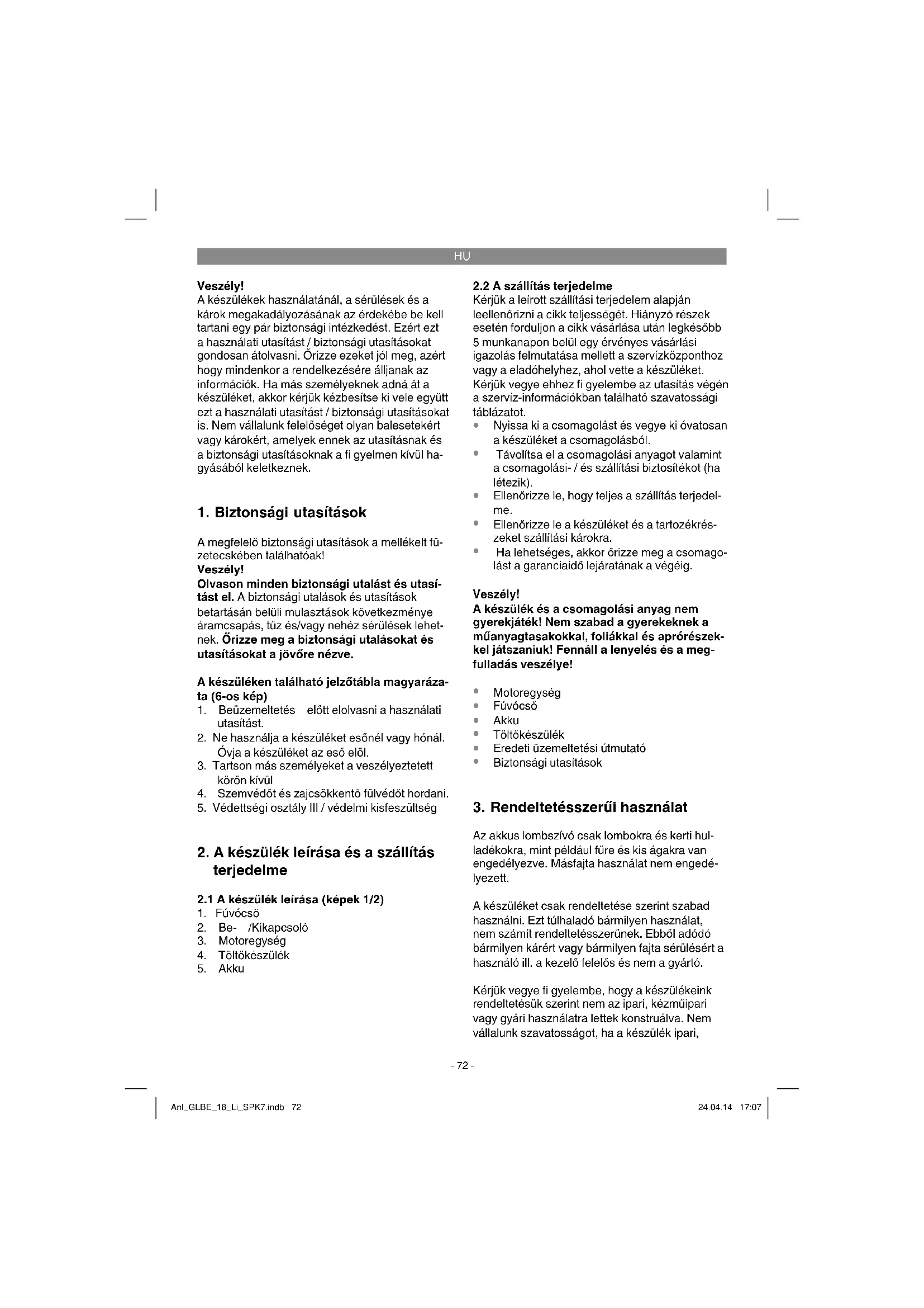 Az akkus lombszívó csak lombokra és kerti hul- ladékokra, mint például fűre és kis ágakra van engedélyezve. Másfajta használat nem engedé- lyezett. A készüléket csak rendeltetése szerint szabad használni. Ezt túlhaladó bármilyen használat, nem számít rendeltetésszerűnek. Ebből adódó bármilyen kárért vagy bármilyen fajta sérülésért a használó ill. a kezelő felelős és nem a gyártó. Kérjük vegye fi gyelembe, hogy a készülékeink rendeltetésük szerint nem az ipari, kézműipari vagy gyári használatra lettek konstruálva. Nem vállalunk szavatosságot, ha a készülék ipari, Anl_GLBE_18_Li_SPK7.indb 72Anl_GLBE_18_Li_SPK7.indb 72 24.04.14 17:0724.04.14 17:07HU