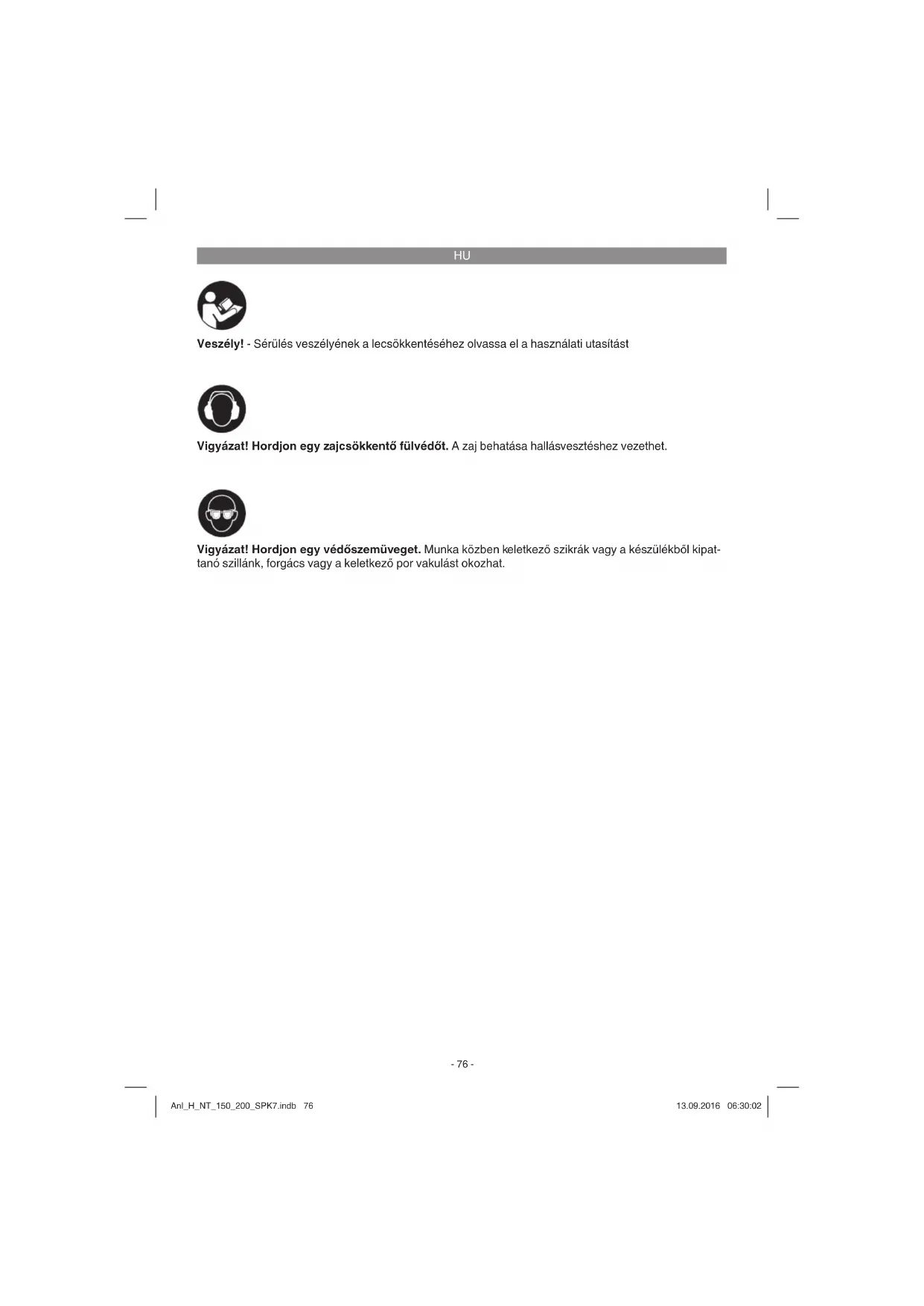 Veszély! - Sérülés veszélyének a lecsökkentéséhez olvassa el a használati utasítást Vigyázat! Hordjon egy zajcsökkentő fülvédőt. A zaj behatása hallásvesztéshez vezethet. Vigyázat! Hordjon egy védőszemüveget. Munka közben keletkező szikrák vagy a készülékből kipat- tanó szillánk, forgács vagy a keletkező por vakulást okozhat. Anl_H_NT_150_200_SPK7.indb 76Anl_H_NT_150_200_SPK7.indb 76 13.09.2016 06:30:0213.09.2016 06:30:02HU