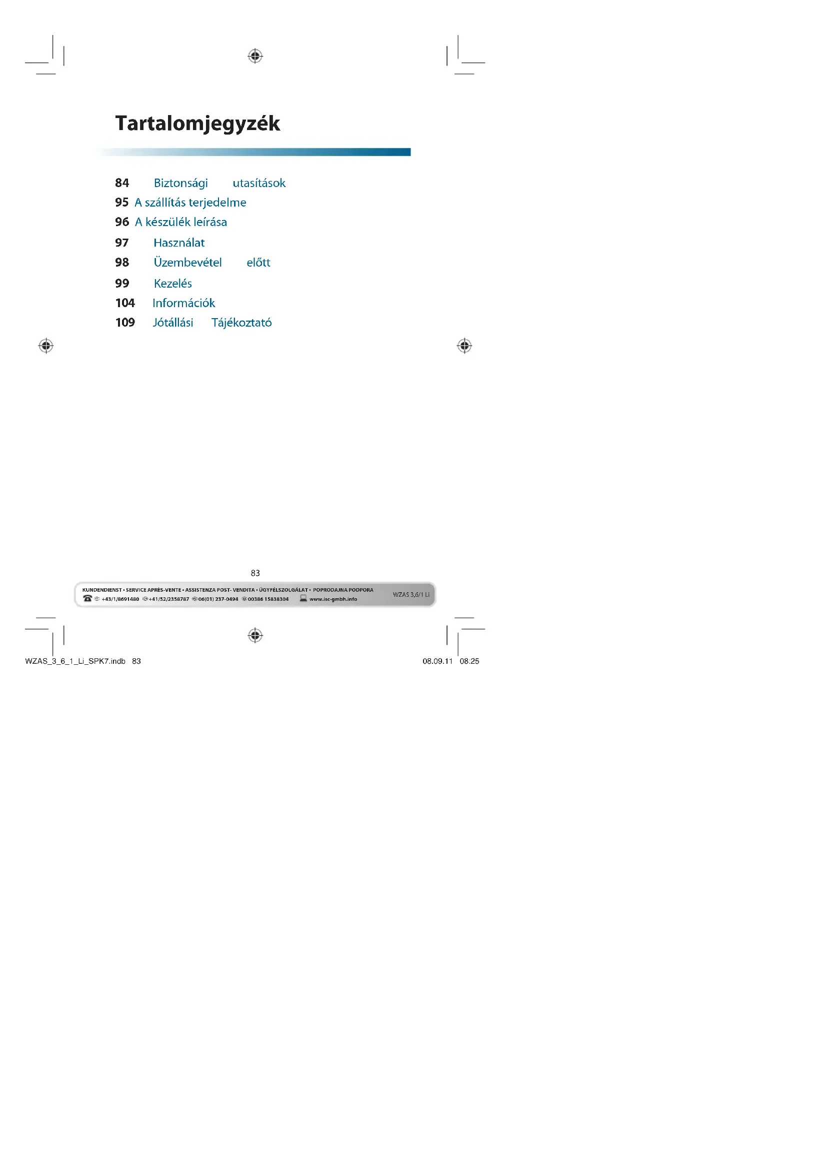 +43/1/8691480 +41/52/2358787 06(01) 237-0494 00386 15838304KUNDENDIENST • SERVICE APRÈS-VENTE • ASSISTENZA POST- VENDITA • ÜGYFÉLSZOLGÁLAT • POPRODAJNA PODPORAwww.isc-gmbh.info WZAS 3,6/1 Li Tartalomjegyzék 84 Biztonsági utasítások 95 A szállítás terjedelme 96 A készülék leírása 97 Használat 98 Üzembevétel előtt 99 Kezelés 104 Információk 109 Jótállási Tájékoztató WZAS_3_6_1_Li_SPK7.indb 83WZAS_3_6_1_Li_SPK7.indb 83 08.09.11 08:2508.09.11 08:2584