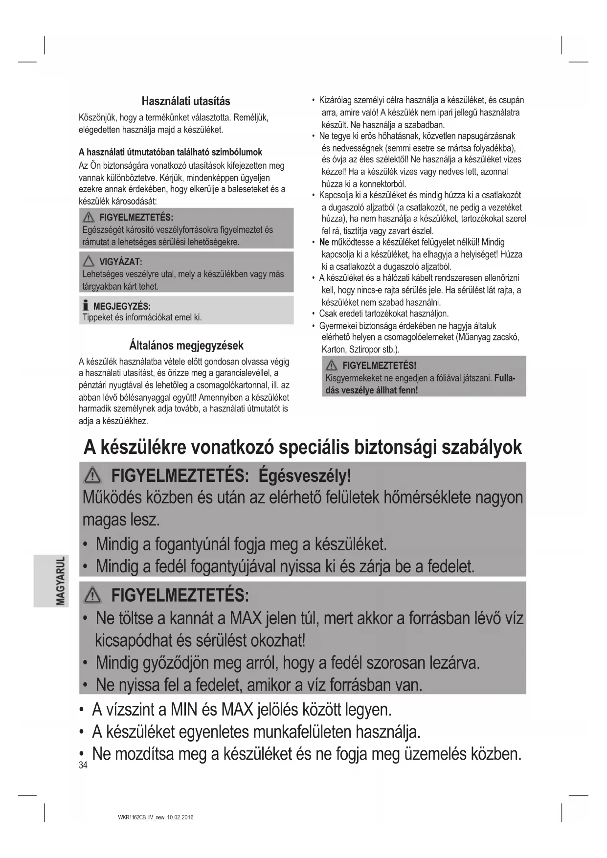 - Gyermekei biztonsága érdekében ne hagyja általuk elérhető helyen a csomagolóelemeket (Műanyag zacskó, Karton, Sztiropor stb.). FIGYELMEZTETÉS! Kisgyermekeket ne engedjen a fóliával játszani. Fulla- dás veszélye állhat fenn! A készülékre vonatkozó speciális biztonsági szabályok FIGYELMEZTETÉS: Égésveszély! Működés közben és után az elérhető felületek hőmérséklete nagyon magas lesz.