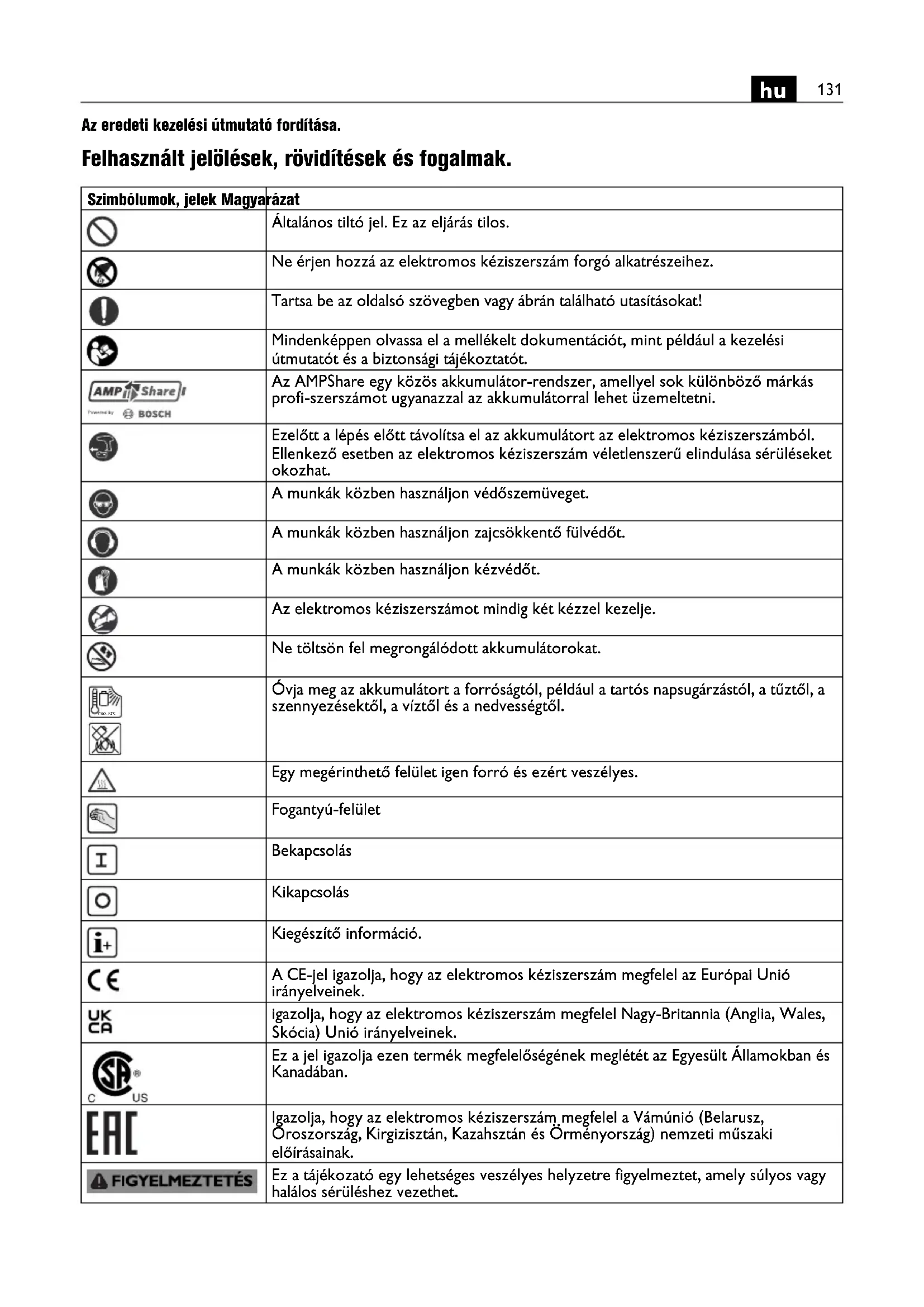 Az eredeti kezelési útmutató fordítása. Felhasznált jelölések, rövidítések és fogalmak. Szimbólumok, jelek Magyarázat Általános tiltó jel. Ez az eljárás tilos. Ne érjen hozzá az elektromos kéziszerszám forgó alkatrészeihez. Tartsa be az oldalsó szövegben vagy ábrán található utasításokat! Mindenképpen olvassa el a mellékelt dokumentációt, mint például a kezelési útmutatót és a biztonsági tájékoztatót. Az AMPShare egy közös akkumulátor-rendszer, amellyel sok különböző márkás profi-szerszámot ugyanazzal az akkumulátorral lehet üzemeltetni. Ezelőtt a lépés előtt távolítsa el az akkumulátort az elektromos kéziszerszámból. Ellenkező esetben az elektromos kéziszerszám véletlenszerű elindulása sérüléseket okozhat. A munkák közben használjon védőszemüveget. A munkák közben használjon zajcsökkentő fülvédőt. A munkák közben használjon kézvédőt. Az elektromos kéziszerszámot mindig két kézzel kezelje. Ne töltsön fel megrongálódott akkumulátorokat. Óvja meg az akkumulátort a forróságtól, például a tartós napsugárzástól, a tűztől, a szennyezésektől, a víztől és a nedvességtől. Egy megérinthető felület igen forró és ezért veszélyes. Fogantyú-felület Bekapcsolás Kikapcsolás Kiegészítő információ. A CE-jel igazolja, hogy az elektromos kéziszerszám megfelel az Európai Unió irányelveinek. igazolja, hogy az elektromos kéziszerszám megfelel Nagy-Britannia (Anglia, Wales, Skócia) Unió irányelveinek. Ez a jel igazolja ezen termék megfelelőségének meglétét az Egyesült Államokban és Kanadában. Igazolja, hogy az elektromos kéziszerszám megfelel a Vámúnió (Belarusz, Oroszország, Kirgizisztán, Kazahsztán és Örményország) nemzeti műszaki előírásainak. Ez a tájékozató egy lehetséges veszélyes helyzetre figyelmeztet, amely súlyos vagy halálos sérüléshez vezethet. max.50°C132