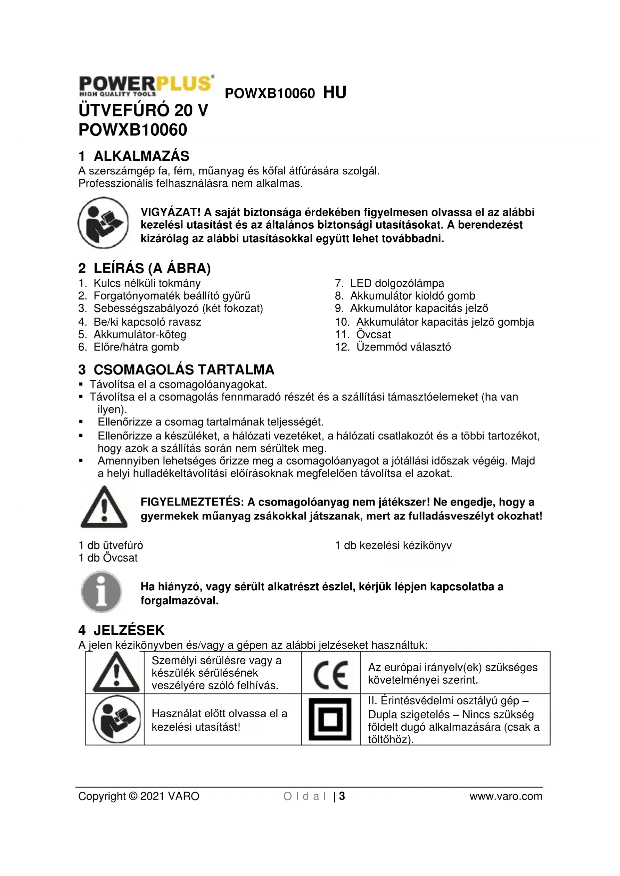 Dupla szigetelés – Nincs szükség földelt dugó alkalmazására (csak a töltőhöz).POWXB10060 HU Copyright © 2021 VARO O l d a l | 4 www.varo.com
