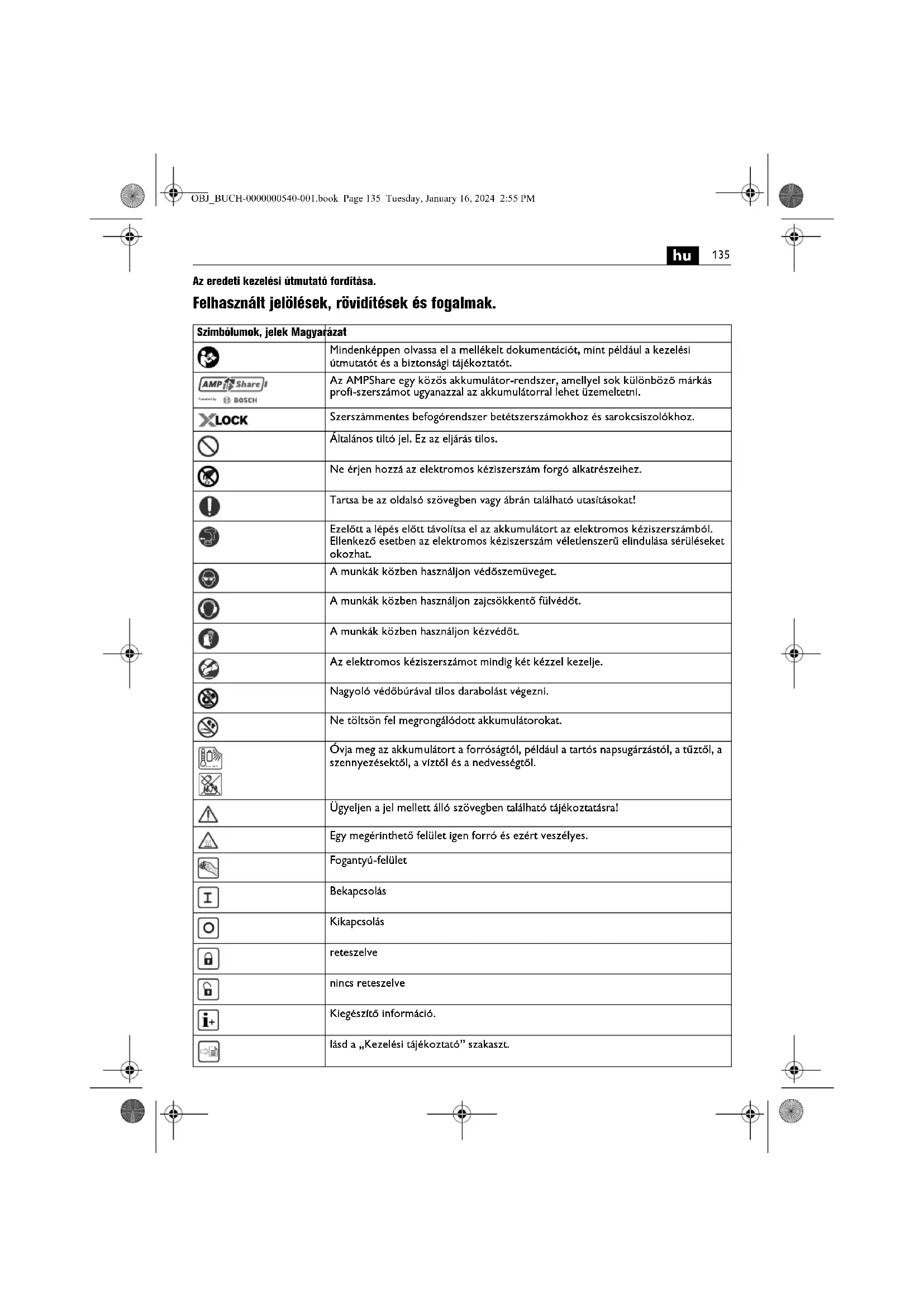 Az eredeti kezelési útmutató fordítása. Felhasznált jelölések, rövidítések és fogalmak. Szimbólumok, jelek Magyarázat Mindenképpen olvassa el a mellékelt dokumentációt, mint például a kezelési útmutatót és a biztonsági tájékoztatót. Az AMPShare egy közös akkumulátor-rendszer, amellyel sok különböző márkás profi-szerszámot ugyanazzal az akkumulátorral lehet üzemeltetni. Szerszámmentes befogórendszer betétszerszámokhoz és sarokcsiszolókhoz. Általános tiltó jel. Ez az eljárás tilos. Ne érjen hozzá az elektromos kéziszerszám forgó alkatrészeihez. Tartsa be az oldalsó szövegben vagy ábrán található utasításokat! Ezelőtt a lépés előtt távolítsa el az akkumulátort az elektromos kéziszerszámból. Ellenkező esetben az elektromos kéziszerszám véletlenszerű elindulása sérüléseket okozhat. A munkák közben használjon védőszemüveget. A munkák közben használjon zajcsökkentő fülvédőt. A munkák közben használjon kézvédőt. Az elektromos kéziszerszámot mindig két kézzel kezelje. Nagyoló védőbúrával tilos darabolást végezni. Ne töltsön fel megrongálódott akkumulátorokat. Óvja meg az akkumulátort a forróságtól, például a tartós napsugárzástól, a tűztől, a szennyezésektől, a víztől és a nedvességtől. Ügyeljen a jel mellett álló szövegben található tájékoztatásra! Egy megérinthető felület igen forró és ezért veszélyes. Fogantyú-felület Bekapcsolás Kikapcsolás reteszelve nincs reteszelve Kiegészítő információ. lásd a „Kezelési tájékoztató” szakaszt. max.50°C OBJ_BUCH-0000000540-001.book Page 135 Tuesday, January 16, 2024 2:55 PM136
