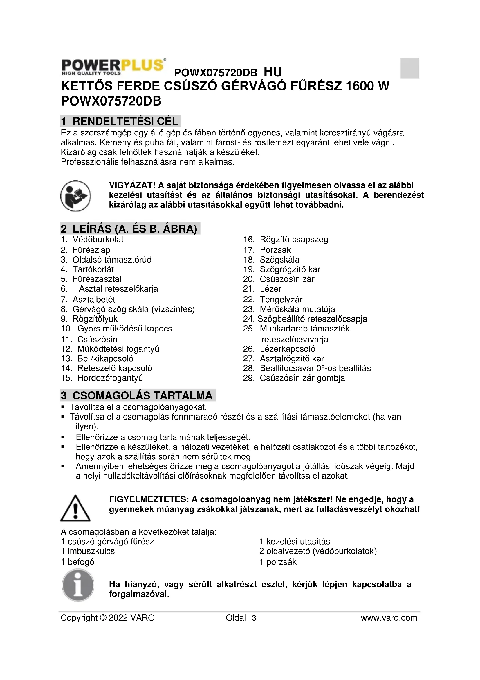 - Amennyiben lehetséges őrizze meg a csomagolóanyagot a jótállási időszak végéig. Majd a helyi hulladékeltávolítási előírásoknak megfelelően távolítsa el azokat. FIGYELMEZTETÉS: A csomagolóanyag nem játékszer! Ne engedje, hogy a gyermekek műanyag zsákokkal játszanak, mert az fulladásveszélyt okozhat! A csomagolásban a következőket találja: 1 csúszó gérvágó fűrész 1 imbuszkulcs 1 befogó 1 kezelési utasítás 2 oldalvezető (védőburkolatok) 1 porzsák Ha hiányzó, vagy sérült alkatrészt észlel, kérjük lépjen kapcsolatba a forgalmazóval.POWX075720DB HU Copyright © 2022 VARO Oldal | 4 www.varo.com 4 JELZÉSEK A jelen kézikönyvben és/vagy a gépen az alábbi jelzéseket használtuk: