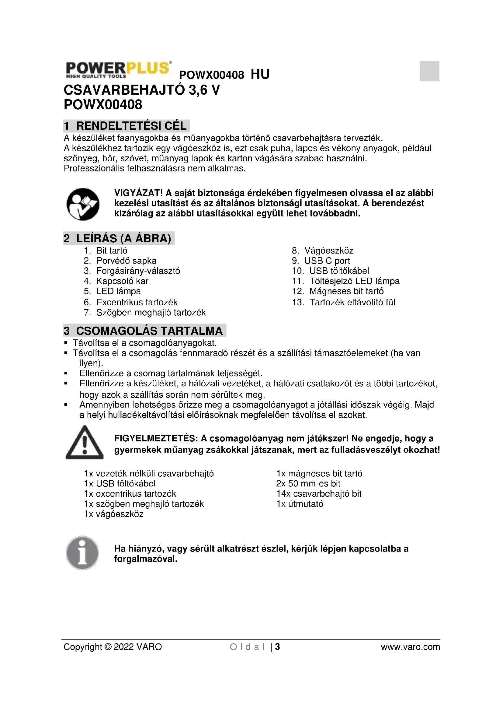 Ha a gép elhasználódott, ne dobja a háztartási szemétbe, hanem gondoskodjon környezetbarát elhelyezéséről! Az elhasználódott elektromos termékeket ne dobja a háztartási hulladékok közé. Kérjük, hogy gondoskodjon azok újrahasznosításáról, amennyiben erre lehetősége van. Az újrahasznosítási lehetőségekről érdeklődjön a helyi köztisztasági szerveknél!POWX00408 HU Copyright © 2022 VARO O l d a l | 11 www.varo.com