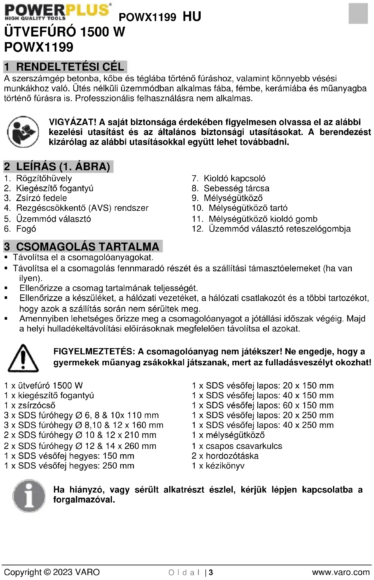 - Amennyiben lehetséges őrizze meg a csomagolóanyagot a jótállási időszak végéig. Majd a helyi hulladékeltávolítási előírásoknak megfelelően távolítsa el azokat. FIGYELMEZTETÉS: A csomagolóanyag nem játékszer! Ne engedje, hogy a gyermekek műanyag zsákokkal játszanak, mert az fulladásveszélyt okozhat! 1 x ütvefúró 1500 W 1 x kiegészítő fogantyú 1 x zsírzócső 3 x SDS fúróhegy Ø 6, 8 & 10x 110 mm 3 x SDS fúróhegy Ø 8,10 & 12 x 160 mm 2 x SDS fúróhegy Ø 10 & 12 x 210 mm 2 x SDS fúróhegy Ø 12 & 14 x 260 mm 1 x SDS vésőfej hegyes: 150 mm 1 x SDS vésőfej hegyes: 250 mm 1 x SDS vésőfej lapos: 20 x 150 mm 1 x SDS vésőfej lapos: 40 x 150 mm 1 x SDS vésőfej lapos: 60 x 150 mm 1 x SDS vésőfej lapos: 20 x 250 mm 1 x SDS vésőfej lapos: 40 x 250 mm 1 x mélységütköző 1 x csapos csavarkulcs 2 x hordozótáska 1 x kézikönyv Ha hiányzó, vagy sérült alkatrészt észlel, kérjük lépjen kapcsolatba a forgalmazóval.POWX1199 HU Copyright © 2023 VARO Oldal | 4 www.varo.com 4 JELZÉSEK A jelen kezelési utasításban és/vagy a készüléken a következő jelzéseket alkalmaztuk: