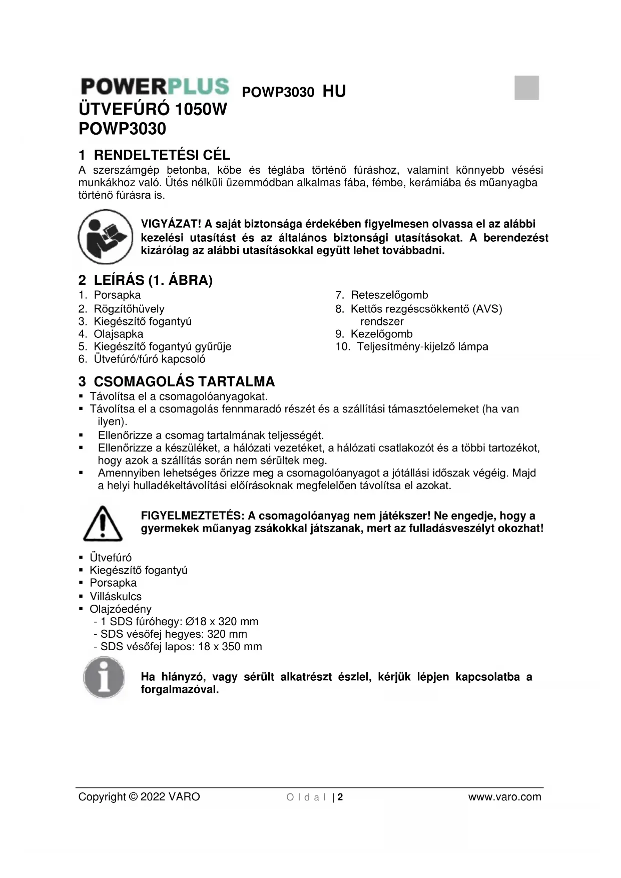 - A szerszámot szétszerelés nélkül és elfogadhatóan tiszta állapotban kell visszaküldeni a forgalmazóhoz, az eredeti formakövető dobozban (ha tartozik ilyen az egységhez) és a vásárlási szelvénnyel együtt.POWP3030 HU Copyright © 2022 VARO O l d a l | 9 www.varo.com