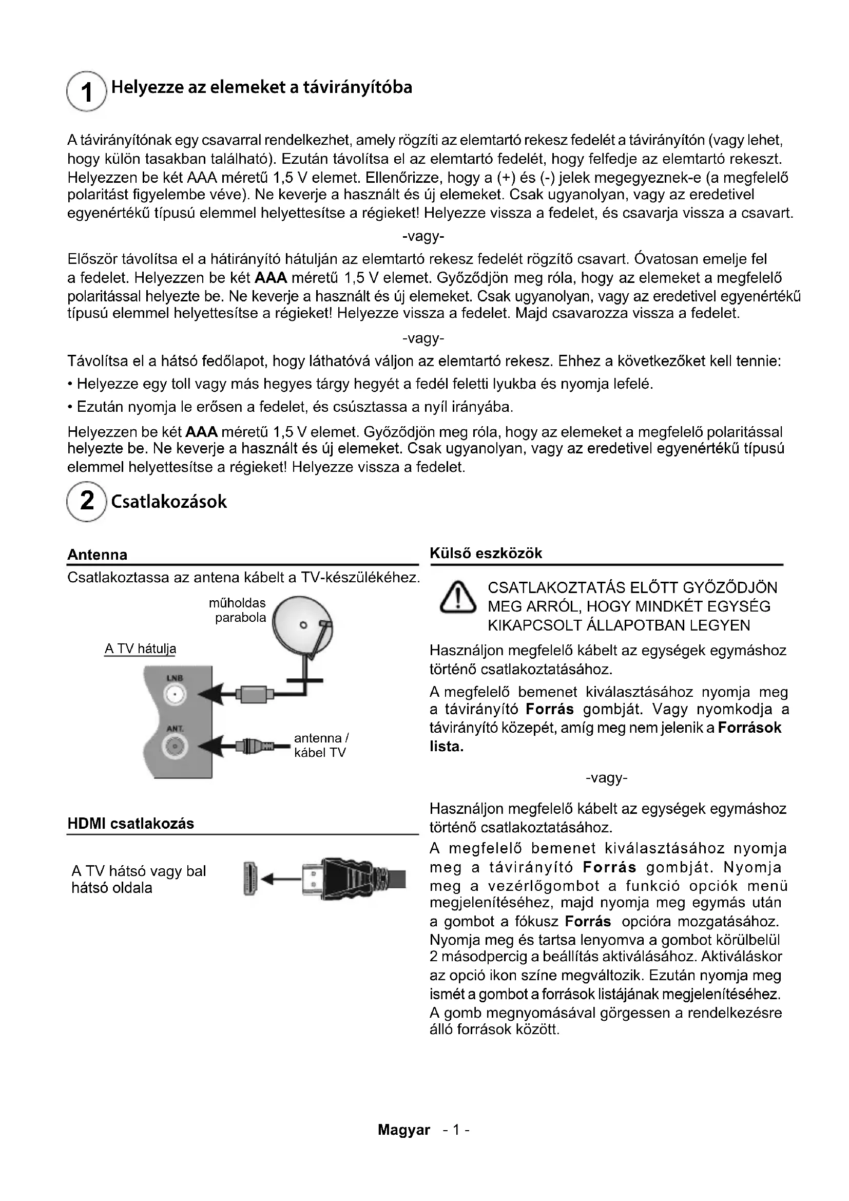 Csatlakozások Antenna Csatlakoztassa az antena kábelt a TV-készülékéhez. műholdas parabola antenna / kábel TV A TV hátulja HDMI csatlakozás A TV hátsó vagy bal hátsó oldala Külső eszközök CSATLAKOZTATÁS ELŐTT GYŐZŐDJÖN MEG ARRÓL, HOGY MINDKÉT EGYSÉG