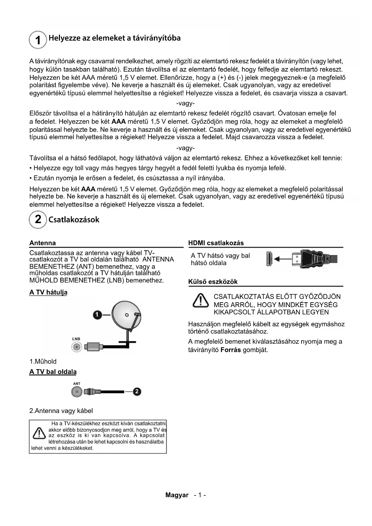ANT 2.Antenna vagy kábel Ha a TV-készülékhez eszközt kíván csatlakoztatni, akkor előbb bizonyosodjon meg arról, hogy a TV és az eszköz is ki van kapcsolva. A kapcsolat létrehozása után be lehet kapcsolni és használatba lehet venni a készülékeket. HDMI csatlakozás A TV hátsó vagy bal hátsó oldala Külső eszközök CSATLAKOZTATÁS ELŐTT GYŐZŐDJÖN MEG ARRÓL, HOGY MINDKÉT EGYSÉG