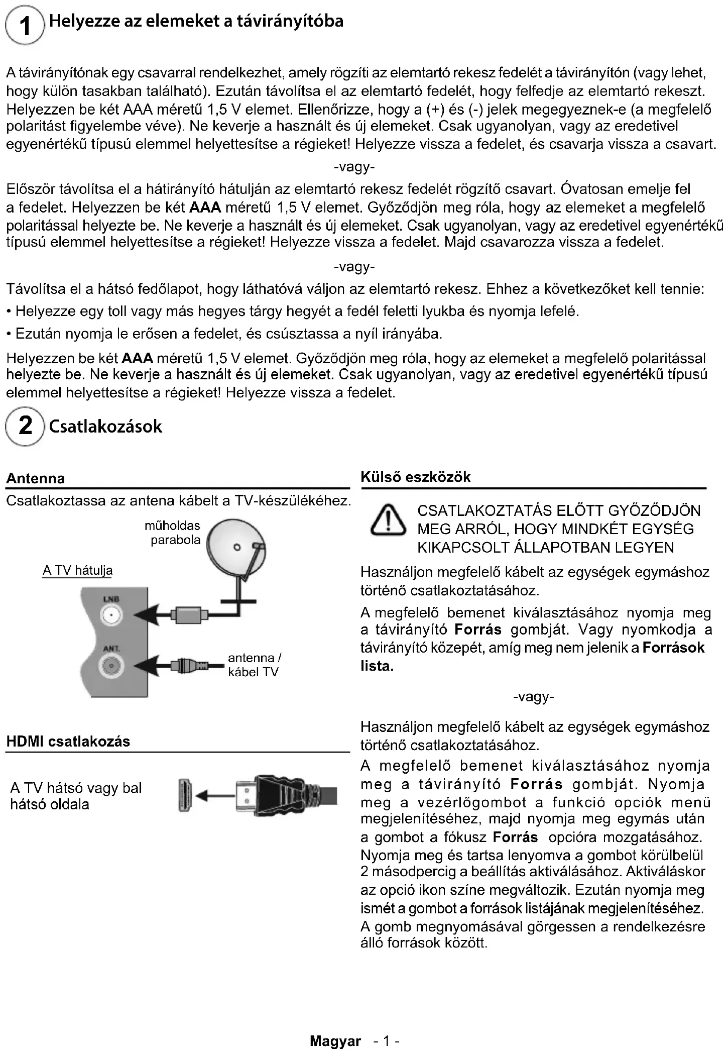 Csatlakozások Antenna Csatlakoztassa az antena kábelt a TV-készülékéhez. műholdas parabola antenna / kábel TV A TV hátulja HDMI csatlakozás A TV hátsó vagy bal hátsó oldala Külső eszközök CSATLAKOZTATÁS ELŐTT GYŐZŐDJÖN MEG ARRÓL, HOGY MINDKÉT EGYSÉG