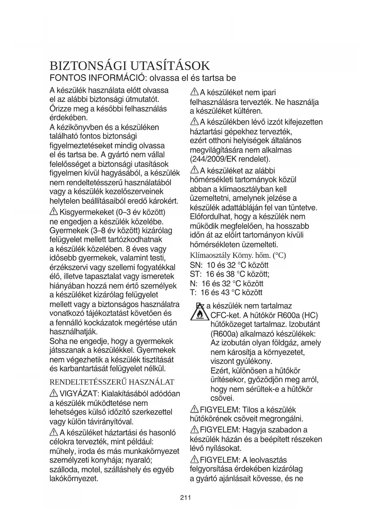 VIGYÁZAT: Kialakításából adódóan a készülék működtetése nem lehetséges külső időzítő szerkezettel vagy külön távirányítóval. A készüléket háztartási és hasonló célokra tervezték, mint például: műhely, iroda és más munkakörnyezet személyzeti konyhája; nyaraló; szálloda, motel, szálláshely és egyéb lakókörnyezet. A készüléket nem ipari felhasználásra tervezték. Ne használja a készüléket kültéren. A készülékben lévő izzót kifejezetten háztartási gépekhez tervezték, ezért otthoni helyiségek általános megvilágítására nem alkalmas (244/2009/EK rendelet). A készüléket az alábbi hőmérsékleti tartományok közül abban a klímaosztályban kell üzemeltetni, amelynek jelzése a készülék adattábláján fel van tüntetve. Előfordulhat, hogy a készülék nem működik megfelelően, ha hosszabb időn át az előírt tartományon kívüli hőmérsékleten üzemelteti. Klímaosztály Körny. hőm. (°C) SN: 10 és 32 °C között ST: 16 és 38 °C között; N: 16 és 32 °C között T: 16 és 43 °C között Ez a készülék nem tartalmaz CFC-ket. A hűtőkör R600a (HC) hűtőközeget tartalmaz. Izobutánt (R600a) alkalmazó készülékek: Az izobután olyan földgáz, amely nem károsítja a környezetet, viszont gyúlékony. Ezért, különösen a hűtőkör ürítésekor, győződjön meg arról, hogy nem sérültek-e a hűtőkör csövei. FIGYELEM: Tilos a készülék hűtőkörének csöveit megrongálni. FIGYELEM: Hagyja szabadon a készülék házán és a beépített részeken lévő nyílásokat. FIGYELEM: A leolvasztás felgyorsítása érdekében kizárólag a gyártó ajánlásait kövesse, és ne212 alkalmazzon egyéb mechanikus, elektromos vagy vegyi módszereket. FIGYELEM: Ne tegyen a készülékbe a gyártó által ajánlottaktól eltérő típusú elektromos berendezéseket, illetve ne használjon ilyeneket. FIGYELEM: A vízhálózatba közvetlenül nem bekötött jégkockakészítőket és/vagy vízadagolókat kizárólag ivóvízzel szabad feltölteni. Ne tároljon robbanásveszélyes anyagokat (pl. aeroszolos akont) a készülékben vagy annak közelében. Ne tegyen benzint vagy egyéb gyúlékony anyagot a készülékbe vagy annak közelébe, illetve ne használjon hasonlókat a készülékben vagy annak közelében. Ne nyelje le a jégakkuban lévő (nem mérgező) folyadékot (bizonyos modelleknél elérhető). Miután a jégkockákat vagy a jégkrémet kivette a készülékből, ne fogyassza el azonnal, mert fagyási sérüléseket szenvedhet. Ha a készülék ventilátorának burkolata alá levegőszűrőt kell helyezni, a szűrőnek a készülék használata közben mindig a helyén kell lennie. A fagyasztótérben ne tároljon folyadékot üvegedényben, az ugyanis széttörhet. A ventilátort (ha van) ne takarja el élelmiszerekkel. Az élelmiszerek behelyezése után győződjön meg arról, hogy a hűtőszekrény ajtajai – különösen a fagyasztó ajtaja – megfelelően be vannak zárva. A sérült tömítéseket a lehető leghamarabb ki kell cserélni. A hűtőteret kizárólag friss élelmiszerek tárolására, a fagyasztóteret pedig mélyhűtött ételek tárolására, friss ételek lefagyasztására és jégkockakészítésre használja. A nem csomagolt élelmiszereket úgy helyezze el, hogy azok ne érjenek hozzá a hűtőtér/fagyasztótér falához. A készülékek speciális rekeszekkel vannak kialakítva (pl. friss élelmiszereket tároló rekesz, zéró hőmérsékletű rekesz stb.). Ha a készülékhez kapott tájékoztató másként nem rendelkezik, a rekeszek eltávolíthatók anélkül, hogy a teljesítmény csökkenne. A C-pentán gyúlékony gáz, amelyet habosítóanyagként használnak a szigetelőhabhoz.