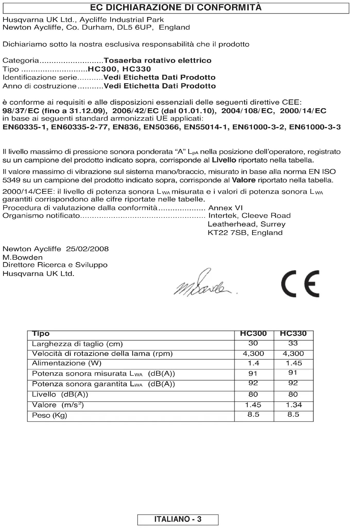 - Figyelmeztetés! A Husqvarna UK Ltd. nem vállal semminemű felelősséget a jótálláson belül az olyan jellegű meghibásodásért, amely részben vagy egészben, közvetlen vagy közvetett módon anem a Husqvarna UK Ltd. által gyártott ill. jóváhagyott cse-realkatrészekkel vagy kiegészítő tartozékokkal történőcseréből vagy a berendezés bármely módon történőmódosításából fakad.EC MEGFELELŐSÉGI TANÚSÍTVÁNY Husqvarna UK Ltd., Aycliffe Industrial Park Newton Aycliffe, Co. Durham, DL5 6UP, England Kizárólagos felelősséget vállalunk azért, hogy a termék(ek): Kategória...........................Forgokeses elektromos funyiro Típus ............................HC300, HC330 Széria azonosítása............Lásd a TermékminősÍtő Cédulát Gyártási Év ........................Lásd a TermékminősÍtő Cédulát Megfelel az alábbi EK irányelvek alapvetőkövetelményeinek és rendelkezéseinek: 98/37/EEC (...-ig 31.12.09), 2006/42/EC (...-tól 01.01.10), 2004/108/EC, 2000/14/EC Az alábbi EU harmonizált szabványok alkalmazásán alapul: EN60335-1, EN60335-2-77, EN836, EN50366, EN55014-1, EN61000-3-2, EN61000-3-3 A maximális A. súlyozású hangnyomás szint L