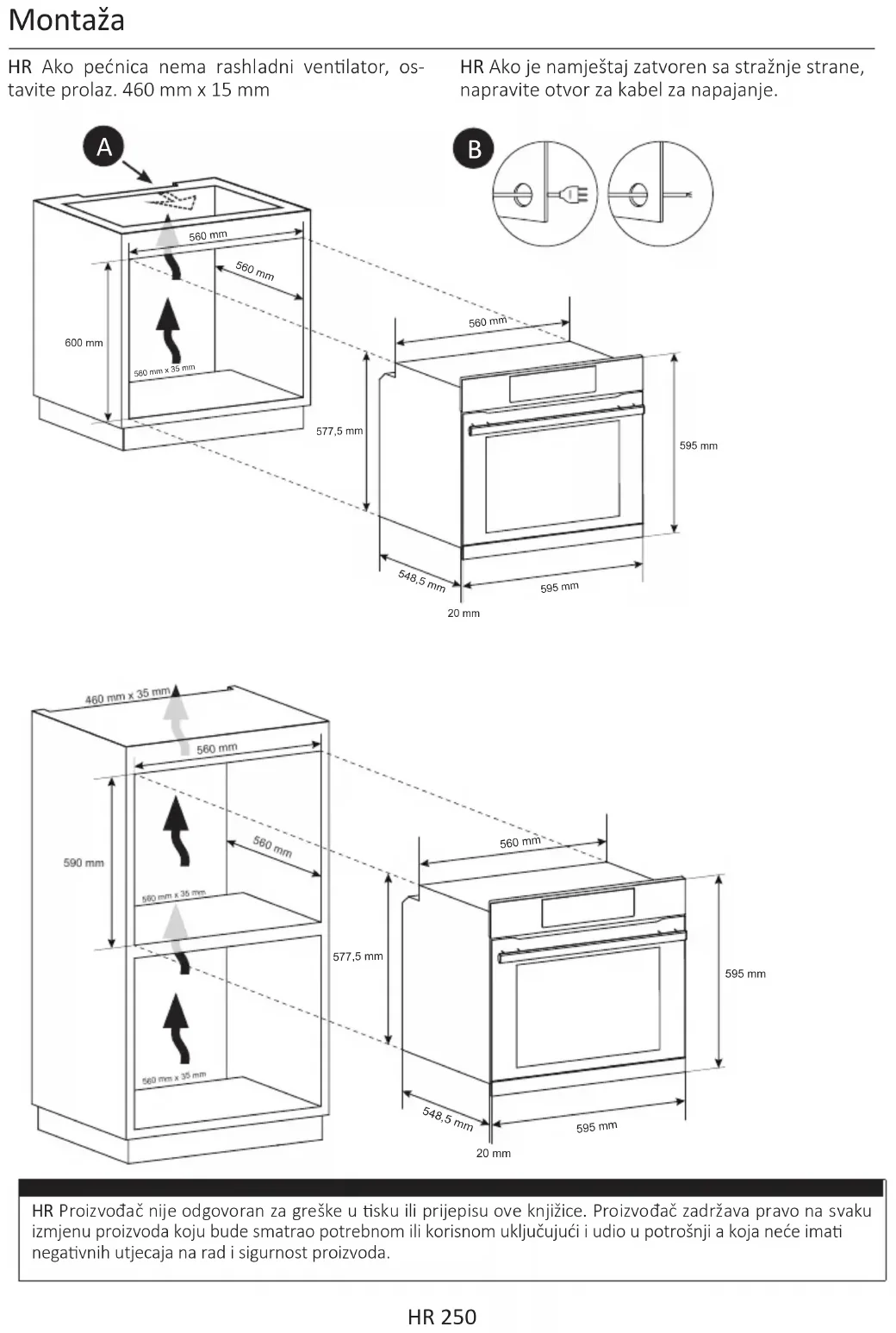 HU Ha a bútor hátul és alul is zárt, akkor biz- tosítson egy nyílást a hálóza csatlakozókábel számára. HU Ha a sütőben nincs hűtővenlátor, hozzon létre egy 460 mm x 15 mm nyílást HU Agyarto nem vallal felelősseget az ebben a kiadvanyban előfordulo nyomtatasi es elirasi hibakbol eredő pontatlansagokert. Abiztonsaggal vagy aműkodessel kapcsolatos jellemzők serelme nelkul fenntartjuk a jogot a termekek szukseg szerin valtoztatasara.DE 271 Sicherheitshinweise Allgemeine Anweisungen Produktbeschreibung Betrieb des Backofens Kochmodi Reinigung und Wartung des Backofens Allgemeine Reinigungshinweise Häug gestellte fragen Installaon Zusammenfassung