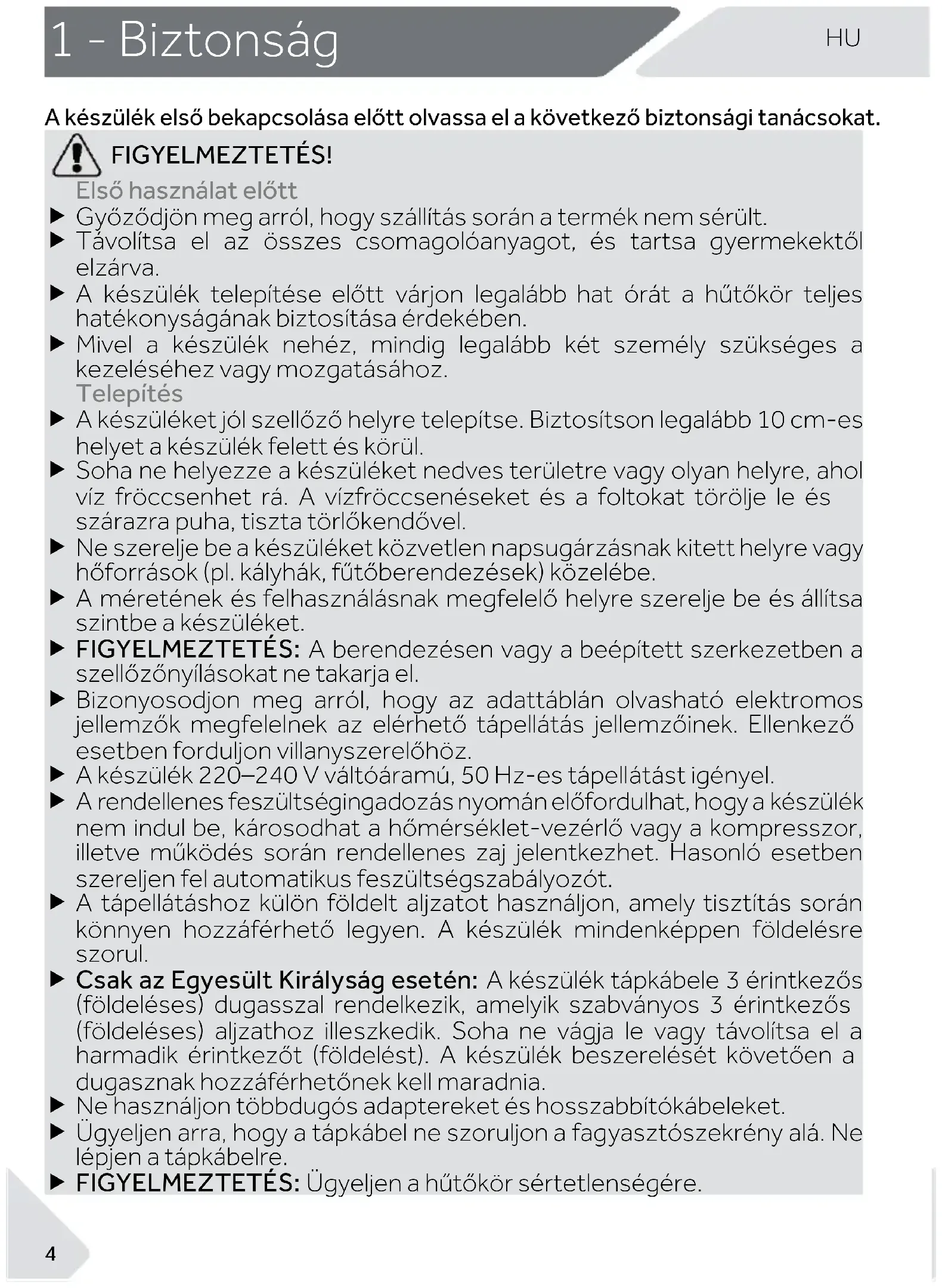 FIGYELMEZTETÉS! Első használat előtt Győződjön meg arról, hogy szállítás során a termék nem sérült. Távolítsa el az összes csomagolóanyagot, és tartsa gyermekektől elzárva. A készülék telepítése előtt várjon legalább hat órát a hűtőkör teljes hatékonyságának biztosítása érdekében. Mivel a készülék nehéz, mindig legalább két személy szükséges a kezeléséhez vagy mozgatásához. Telepítés A készüléket jól szellőző helyre telepítse. Biztosítson legalább 10 cm-es helyet a készülék felett és körül. Soha ne helyezze a készüléket nedves területre vagy olyan helyre, ahol víz fröccsenhet rá. A vízfröccsenéseket és a foltokat törölje le és szárazra puha, tiszta törlőkendővel. Ne szerelje be a készüléket közvetlen napsugárzásnak kitett helyre vagy hőforrások (pl. kályhák, fűtőberendezések) közelébe. A méretének és felhasználásnak megfelelő helyre szerelje be és állítsa szintbe a készüléket. FIGYELMEZTETÉS: A berendezésen vagy a beépített szerkezetben a szellőzőnyílásokat ne takarja el. Bizonyosodjon meg arról, hogy az adattáblán olvasható elektromos jellemzők megfelelnek az elérhető tápellátás jellemzőinek. Ellenkező esetben forduljon villanyszerelőhöz. A készülék 220–240 V váltóáramú, 50 Hz-es tápellátást igényel. A rendellenes feszültségingadozás nyomán előfordulhat, hogy a készülék nem indul be, károsodhat a hőmérséklet-vezérlő vagy a kompresszor, illetve működés során rendellenes zaj jelentkezhet. Hasonló esetben szereljen fel automatikus feszültségszabályozót. A tápellátáshoz külön földelt aljzatot használjon, amely tisztítás során könnyen hozzáférhető legyen. A készülék mindenképpen földelésre szorul. Csak az Egyesült Királyság esetén: A készülék tápkábele 3 érintkezős (földeléses) dugasszal rendelkezik, amelyik szabványos 3 érintkezős (földeléses) aljzathoz illeszkedik. Soha ne vágja le vagy távolítsa el a harmadik érintkezőt (földelést). A készülék beszerelését követően a dugasznak hozzáférhetőnek kell maradnia. Ne használjon többdugós adaptereket és hosszabbítókábeleket. Ügyeljen arra, hogy a tápkábel ne szoruljon a fagyasztószekrény alá. Ne lépjen a tápkábelre. FIGYELMEZTETÉS: Ügyeljen a hűtőkör sértetlenségére.HU