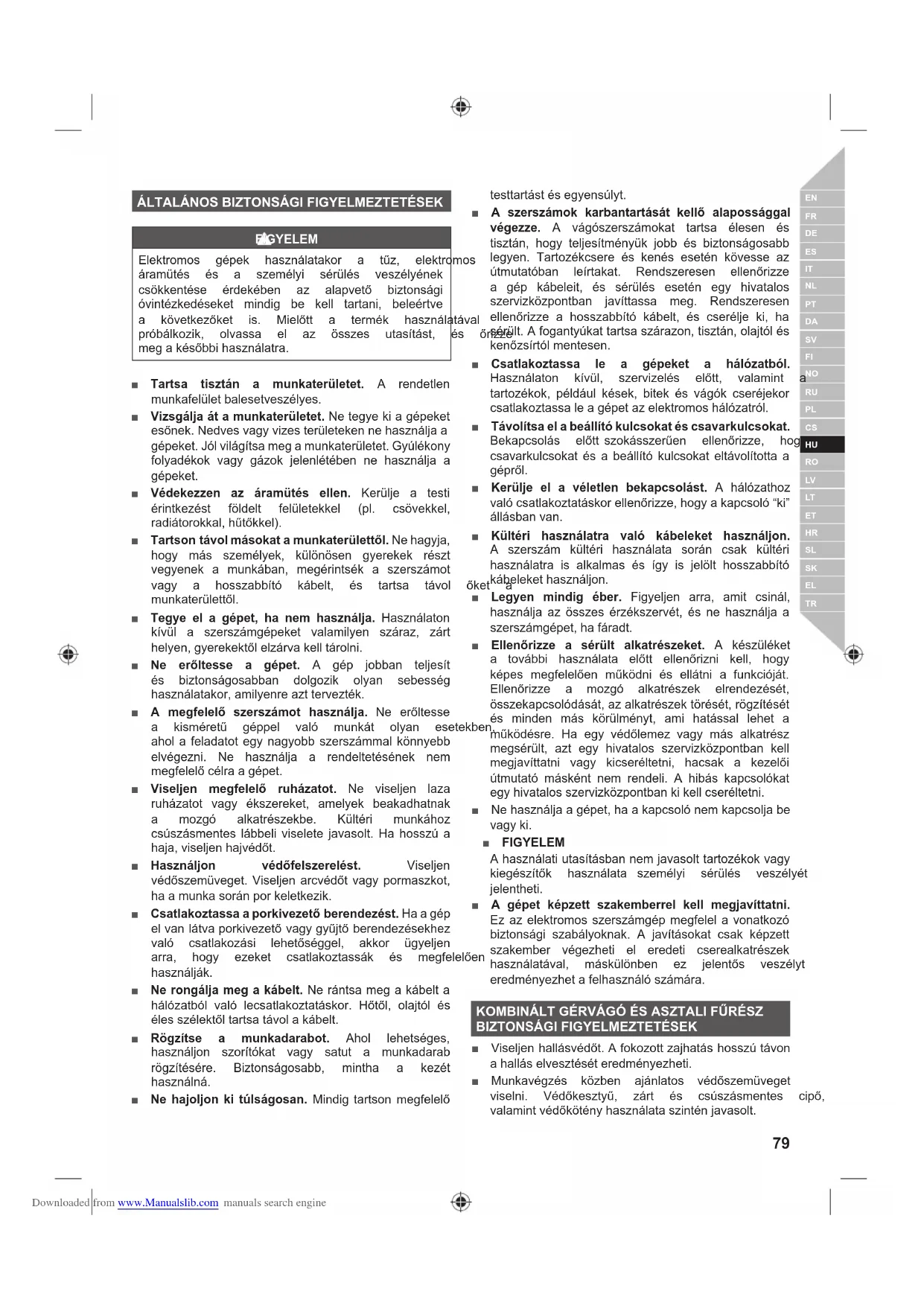 Ŷ 9LVHOMHQKDOOiVYpGĘW$IRNR]RWW]DMKDWiVKRVV]~WiYRQ a hallás elvesztését eredményezheti. Ŷ 0XQNDYpJ]pV N|]EHQ DMiQODWRV YpGĘV]HPYHJHW YLVHOQL 9pGĘNHV]W\Ħ ]iUW pV FV~V]iVPHQWHV FLSĘ YDODPLQWYpGĘN|WpQ\KDV]QiODWDV]LQWpQMDYDVROW Downloaded from www.Manualslib.com manuals search engine80 | Magyar Ŷ Elektromos szerszámgépek használatakor vagy a SRU NLI~YiVDNRU PLQGLJ YLVHOMHQ YpGĘV]HPYHJHW ami a szemet oldalról is védi. Ha a használat poros környezetben történik, vegyen fel egy pormaszkot is. Ŷ A gép egy speciálisan konfigurált tápkábellel van ellátva. Ha a tápkábel sérült vagy más módon meghibásodott, azt a veszélyek elkerülése érdekében csak a szervizszakember cserélheti ki. Ŷ %iUPLO\HQPĦYHOHWPHJNH]GpVHHOĘWWHOOHQĘUL]]HKRJ\ D]|VV]HVU|J]tWĘJRPEPHJYDQK~]YD Ŷ 1H KDV]QiOMD D IĦUpV]W KD D YpGĘEXUNRODWRN nincsenek a helyükön, különösen üzemmódváltás XWiQ $ YpGĘEHUHQGH]pVHN OHJ\HQHN PĦN|GĘNpSHV PHJIHOHOĘHQNDUEDQWDUWRWWiOODSRWEDQ Ŷ 1HWHJ\HHJ\LNNH]pWVHPDIĦUpV]ODSWHUOHWpUHKDD IĦUpV]FVDWODNR]WDWYDYDQD]HOHNWURPRViUDPIRUUiVKR] Ŷ Ne próbálja hirtelen megállítani a gépet, ha mozgásban van, úgy, hogy beakaszt egy szerszámot vagy más WiUJ\DWDIĦUpV]ODSEDPHUWH]V~O\RVEDOHVHWHWRNR]KDW Ŷ %iUPLO\HQ WDUWR]pN KDV]QiODWD HOĘWW ROYDVVD HO D KDV]QiODWL ~WPXWDWyW (J\ NLHJpV]tWĘ QHP PHJIHOHOĘ használata sérülést okozhat. Ŷ Ne alakítsa át és ne módosítsa a berendezés eredeti kialakítását vagy funkcióját. Ŷ Ügyeljen arra, hogy a használt távtartók és WHQJHO\J\ĦUĦN D Np]LN|Q\YEHQ PHJDGRWWDNQDN PHJIHOHOĘHQDONDOPDVDNOHJ\HQHNDFpOUD Ŷ 9iODVV]DNLDYiJDQGyDQ\DJKR]PHJIHOHOĘIĦUpV]ODSRW Ŷ hJ\HOMHQ D IĦUpV]ODSRQ OiWKDWy PD[LPiOLV IRUGXODWV]iPUDhJ\HOMHQDUUDKRJ\DIĦUpV]ODSROGDOiQ megadott fordulatszámérték legalább annyi legyen, PLQWDIĦUpV]HQPHJDGRWW Ŷ +DV]QiOMRQ WDUWyW YDJ\ YLVHOMHQ NHV]W\ĦW D IĦUpV]ODS kezelésekor. Ŷ +DV]QiODWHOĘWWJ\Ę]ĘGM|QPHJUyODKRJ\DIĦUpV]ODS PHJIHOHOĘHQU|J]tWYHYDQ Ŷ (OOHQĘUL]]HKRJ\DIĦUpV]ODSDPHJIHOHOĘLUiQ\EDIRURJ 7DUWVDpOHVHQDIĦUpV]ODSRW Ŷ 9HJ\H IRQWROyUD VSHFLiOLV ]DMFV|NNHQWĘ IĦUpV]ODSRN felszerelését. Ŷ (PHOMHNLDIĦUpV]ODSRWDMiUDWEyOpVDPXQNDGDUDEEyOD NDSFVROyIHOHQJHGpVHHOĘWW Ŷ hJ\HOMHQ DUUD KRJ\ D NDU HUĘVHQ U|J]tWYH OHJ\HQ ferdevágások végrehajtásakor. Ŷ hJ\HOMHQ DUUD KRJ\ DV]WDOL IĦUpV] PyGEDQ D NDU EL]WRVDQOHJ\HQPĦN|GpVLKHO\]HWEHQU|J]tWYH Ŷ hJ\HOMHQ DUUD KRJ\ D] IĦUpV]DV]WDO EL]WRVDQ OHJ\HQ rögzítve a kiválasztott magasságban. Ŷ Ne tartson semmit a ventilátorhoz, hogy megállítsa a motortengelyt. Ŷ $ IĦUpV]HQ WDOiOKDWy IĦUpV]ODSYpGĘ DXWRPDWLNXVDQ megemelkedik a kar lenyomásakor, ráfekszik a IĦUpV]ODSUD D NDU IHOHQJHGpVHNRU $ YpGĘEXUNRODW Np]]HO IHOHPHOKHWĘ D IĦUpV]ODS HOWiYROtWiVDNRU YDJ\ OHV]HUHOpVHNRU YDJ\ D IĦUpV] iWYL]VJiOiVDNRU 1H HPHOMHIHONp]]HODIĦUpV]ODSYpGĘWDGGLJDPtJDIĦUpV] nincs kikapcsolva. Ŷ A gép környezetét tartsa jól karban és laza anyagoktól, SpOGiXOIDIRUJiFVWyOpVQ\HVHGpNHNWĘOPHQWHVHQ Ŷ 5HQGV]HUHVHQ HOOHQĘUL]]H KRJ\ D PRWRU V]HOOĘ]ĘQ\tOiVDLWLV]WiNpVIRUJiFVPHQWHVHN Ŷ Válassza le a gépet a hálózatról bármilyen karbantartási PXQNDHOYpJ]pVHHOĘWWYDJ\DIĦUpV]ODSFVHUpMHNRU Ŷ Ne hajtson végre semmilyen tisztítási vagy karbantartási PĦYHOHWHWKDDJpSPpJIRURJpVDIHMQLQFVQ\XJDOPL pozícióban. Ŷ Ha lehet, mindig rögzítse a gépet egy munkapadhoz, és HOOHQĘUL]]HDSDGKR]U|J]tWpVEL]WRQViJRVViJiW Ŷ Gérvágás, ferdevágás vagy kombinált vágások YpJUHKDMWiVDNRUiOOtWVDEHDJpUYiJyYH]HWĘVtQWKRJ\ EL]WRVtWVDDPHJIHOHOĘKp]DJRWD]DONDOPD]iVV]iPiUD Ŷ Tartózkodjon a munkadarab levágott vagy más GDUDEMDLQDN D YiJiVL WHUOHWUĘO YDOy HOWiYROtWiViWyO D IĦUpV]PĦN|GpVHN|]EHQ Ŷ $PXQNDPHJNH]GpVHHOĘWWHOOHQĘUL]]HKRJ\DJpSHJ\ vízszintes felületre van helyezve, és elég stabil. Ŷ $ PXQND PHJNH]GpVH HOĘWW EHNDSFVROW PRWRU QpONO végezzen egy próbavágást a vágótárcsa helyzete, a YpGĘEHUHQGH]pVHNPĦN|GpVHDJpSPiVUpV]HLpVD PXQNDGDUDEKHO\]HWHHOOHQĘU]pVHFpOMiEyO Ŷ 1HYiJMRQN|QQ\ĦIpPHWNO|Q|VHQQHPDJQp]LXPRW Ŷ Ne használjon semmilyen csiszoló vagy gyémánttárcsát. Ŷ Baleset vagy a gép meghibásodása esetén azonnal kapcsolja ki a gépet, és válassza le a hálózati áramforrásról. Ŷ Jelentse a meghibásodást és jelölje meg a gépet, hogy megakadályozza a meghibásodott gép más személyek általi használatát. Ŷ +D YiJiV N|]EHQ D IĦUpV]ODS D W~O QDJ\ DGDJROiVL sebesség miatt beakadt, kapcsolja ki a gépet, és válassza le a hálózati áramforrásról. Távolítsa el D PXQNDGDUDERW pV EL]WRVtWVD D IĦUpV]ODS V]DEDG forgását. Kapcsolja be a gépet, és kezdjen meg egy új vágást lassúbb adagolással. Ŷ Ügyeljen rá, hogy a pozíciója mindig a vágásvonaltól jobbra vagy balra legyen. Ŷ %L]WRVtWVRQ PHJIHOHOĘ iOWDOiQRV YDJ\ KHO\L YLOiJtWiVW hogy elkerülje a stroboszkóp hatást és a veszélyeket. Ŷ hJ\HOMHQ DUUD KRJ\ D NH]HOĘ PHJIHOHOĘHQ NL OHJ\HQ képezve a gép használatára, beállítására és PĦN|GWHWpVpUH Ŷ Ha a gép felügyelet nélkül van, kapcsolja ki. Ŷ )D IĦUpV]HOpVHNRU FVDWODNR]WDVVD D IĦUpV]W D SRUJ\ĦMWĘK|]0LQGLJYHJ\HILJ\HOHPEHDSRUNpS]ĘGpVW PHJKDWiUR]yWpQ\H]ĘNHWSpOGiXODPHJPXQNiOWDQ\DJ típusát (a faforgácslapból több por keletkezik, mint a IiEyO D IĦUpV]ODS EHiOOtWiViW D] HOV]tYiV EHiOOtWiViW YDODPLQWDEXUNRODWRNDWWHUHOĘNHWFV~V]GiNDWpVDSRU terjedési sebességét Ŷ 7DUWVDpOHVHQpVPHJIHOHOĘHQEHiOOtWYDDIĦUpV]ODSRW Ŷ 1H SUyEiOMD PHJ D] HOĘtUW IHV]OWVpJWĘO HOWpUĘ feszültségen használni a gépet. Ŷ 1HYLJ\HQIHONHQĘDQ\DJRWDIĦUpV]ODSUDKDIRURJ Ŷ Ügyeljen rá, hogy a bámészkodók ne álljanak a gép mögé. Ŷ A saját biztonsága érdekében mindig rögzítse Downloaded from www.Manualslib.com manuals search engineEN