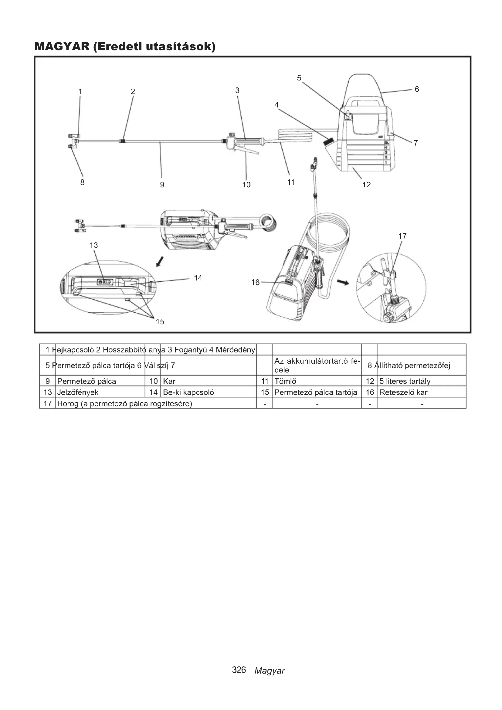 - W opakowaniu mogą znajdować się niektóre produkty z listy, jako wyposażenie standardowe. Mogą się one różnić w zależności od kraju.326 Magyar MAGYAR (Eredeti utasítások) 1 Fejkapcsoló 2 Hosszabbító anya 3 Fogantyú 4 Mérőedény 5 Permetező pálca tartója 6 Vállszíj 7 Az akkumulátortartó fe- dele 8 Állítható permetezőfej 9 Permetező pálca 10 Kar 11 Tömlő 12 5 literes tartály 13 Jelzőfények 14 Be-ki kapcsoló 15 Permetező pálca tartója 16 Reteszelő kar 17 Horog (a permetező pálca rögzítésére) - - - -