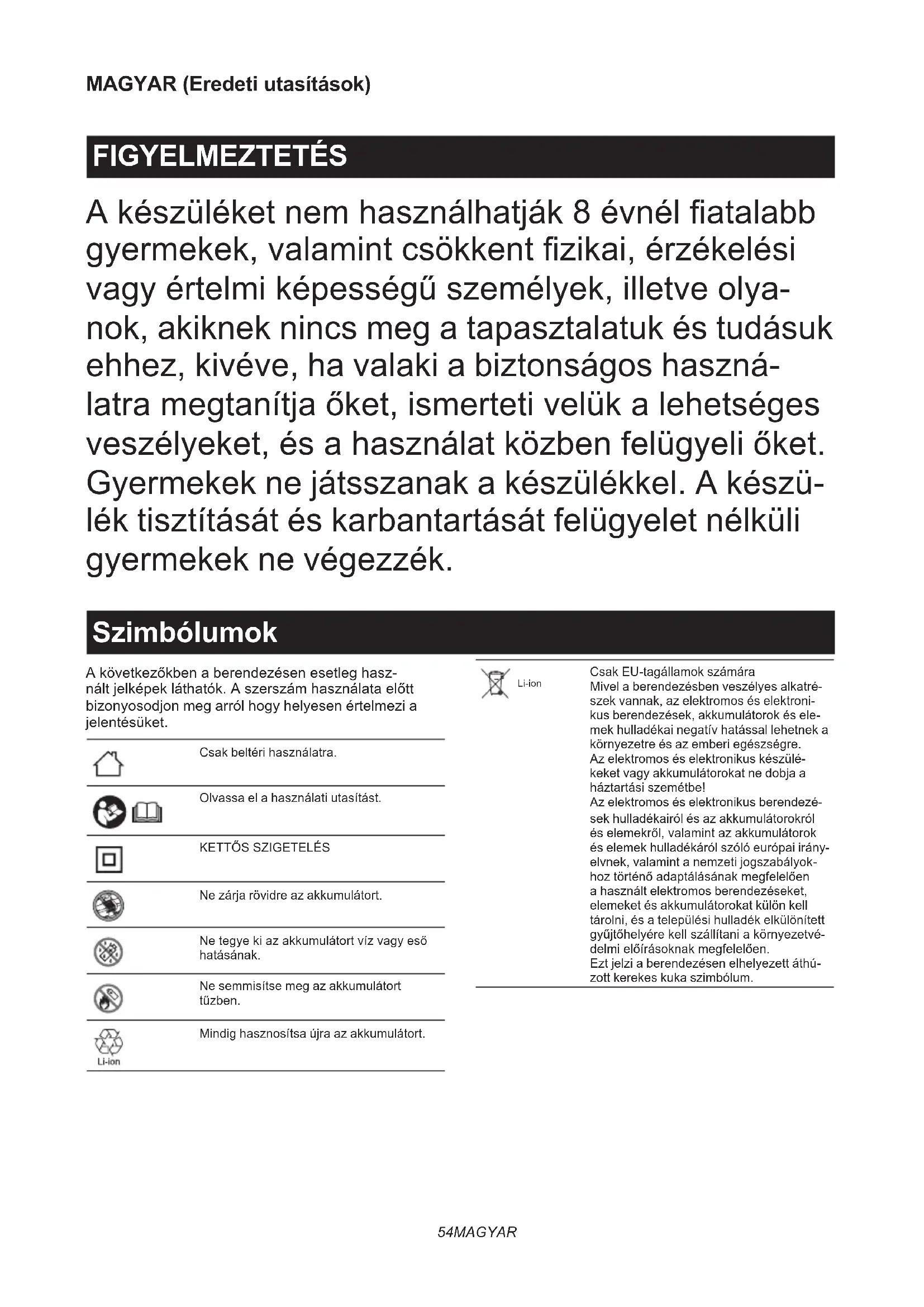 Ne zárja rövidre az akkumulátort. Ne tegye ki az akkumulátort víz vagy eső hatásának. Ne semmisítse meg az akkumulátort tűzben. Mindig hasznosítsa újra az akkumulátort. Li-ion Csak EU-tagállamok számára Mivel a berendezésben veszélyes alkatré- szek vannak, az elektromos és elektroni- kus berendezések, akkumulátorok és ele- mek hulladékai negatív hatással lehetnek a környezetre és az emberi egészségre. Az elektromos és elektronikus készülé- keket vagy akkumulátorokat ne dobja a háztartási szemétbe! Az elektromos és elektronikus berendezé- sek hulladékairól és az akkumulátorokról és elemekről, valamint az akkumulátorok és elemek hulladékáról szóló európai irány- elvnek, valamint a nemzeti jogszabályok- hoz történő adaptálásának megfelelően a használt elektromos berendezéseket, elemeket és akkumulátorokat külön kell tárolni, és a települési hulladék elkülönített gyűjtőhelyére kell szállítani a környezetvé- delmi előírásoknak megfelelően. Ezt jelzi a berendezésen elhelyezett áthú- zott kerekes kuka szimbólum.55 MAGYAR ► Ábra1 Töltésre készen áll. Töltés késleltetése (túl forró vagy túl hideg az akkumulátor). Töltés (0 - 80 %). Töltés (80 - 100 %). Töltés kész. Hibás akkumulátor. VIGYÁZAT