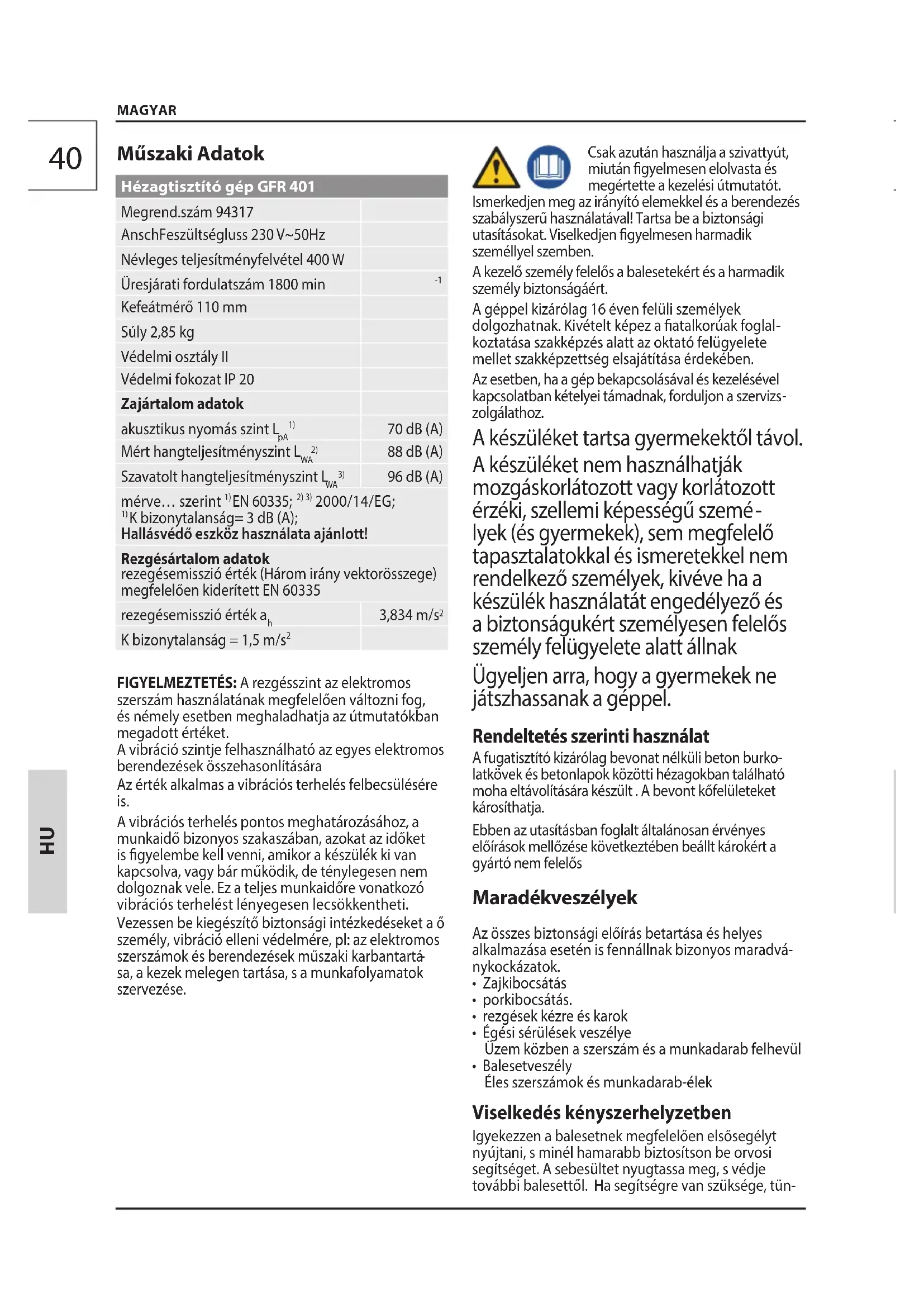Műszaki Adatok Hézagtisztító gép GFR 401 Megrend.szám 94317 AnschFeszültségluss 230 V~50Hz Névleges teljesítményfelvétel 400 W Üresjárati fordulatszám 1800 min