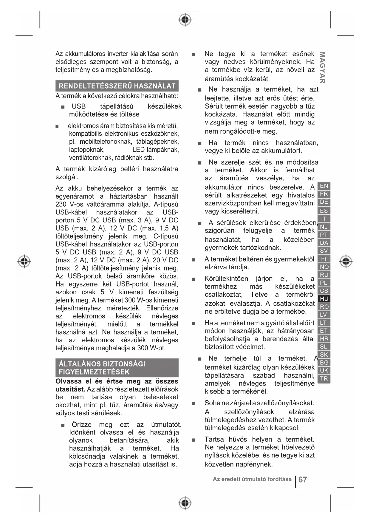 FIGYELMEZTETÉSEK Olvassa el és értse meg az összes utasítást. Az alább részletezett előírások be nem tartása olyan baleseteket okozhat, mint pl. tűz, áramütés és/vagy súlyos testi sérülések. ■ Őrizze meg ezt az útmutatót. Időnként olvassa el és használja olyanok betanítására, akik használhatják a terméket. Ha kölcsönadja valakinek a terméket, adja hozzá a használati utasítást is. ■ Ne tegye ki a terméket esőnek vagy nedves körülményeknek. Ha a termékbe víz kerül, az növeli az áramütés kockázatát. ■ Ne használja a terméket, ha azt leejtette, illetve azt erős ütést érte. Sérült termék esetén nagyobb a tűz kockázata. Használat előtt mindig vizsgálja meg a terméket, hogy az nem rongálódott-e meg. ■ Ha termék nincs használatban, vegye ki belőle az akkumulátort. ■ Ne szerelje szét és ne módosítsa a terméket. Akkor is fennállhat az áramütés veszélye, ha az akkumulátor nincs beszerelve. A sérült alkatrészeket egy hivatalos szervizközpontban kell megjavíttatni vagy kicseréltetni. ■ A sérülések elkerülése érdekében, szigorúan felügyelje a termék használatát, ha a közelében gyermekek tartózkodnak. ■ A terméket beltéren és gyermekektől elzárva tárolja. ■ Körültekintően járjon el, ha a termékhez más készülékeket csatlakoztat, illetve a termékről azokat leválasztja. A csatlakozókat ne erőltetve dugja be a termékbe. ■ Ha a terméket nem a gyártó által előírt módon használják, az hátrányosan befolyásolhatja a berendezés által biztosított védelmet. ■ Ne terhelje túl a terméket. A terméket kizárólag olyan készülékek tápellátására szabad használni, amelyek névleges teljesítménye kisebb a termékénél. ■ Soha ne zárja el a szellőzőnyílásokat. A szellőzőnyílások elzárása túlmelegedéshez vezethet. A termék túlmelegedés esetén kikapcsol. ■ Tartsa hűvös helyen a terméket. Ne helyezze a terméket hőelvezető nyílások közelébe, és ne tegye ki azt közvetlen napfénynek.