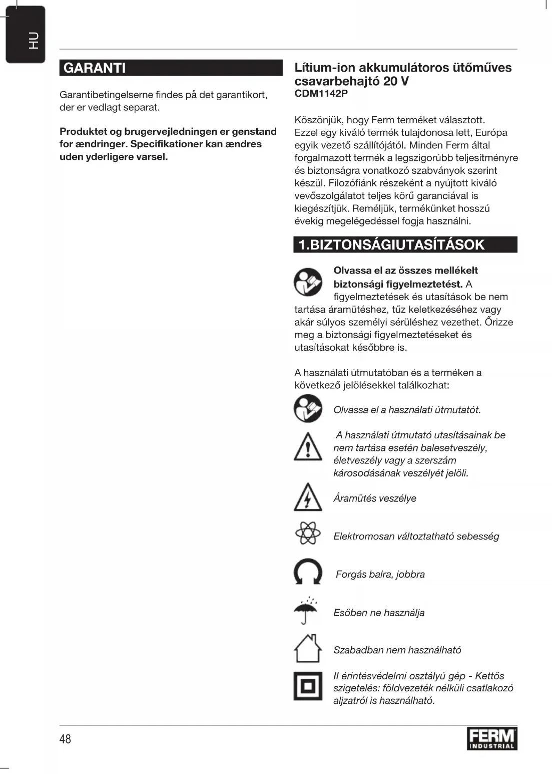 GARANTI Garantibetingelserne findes på det garantikort, der er vedlagt separat. Produktet og brugervejledningen er genstand for ændringer. Specifikationer kan ændres uden yderligere varsel. Lítium-ion akkumulátoros ütőműves csavarbehajtó 20 V CDM1142P Köszönjük, hogy Ferm terméket választott. Ezzel egy kiváló termék tulajdonosa lett, Európa egyik vezető szállítójától. Minden Ferm által forgalmazott termék a legszigorúbb teljesítményre és biztonságra vonatkozó szabványok szerint készül. Filozóánk részeként a nyújtott kiváló vevőszolgálatot teljes körű garanciával is kiegészítjük. Reméljük, termékünket hosszú évekig megelégedéssel fogja használni.