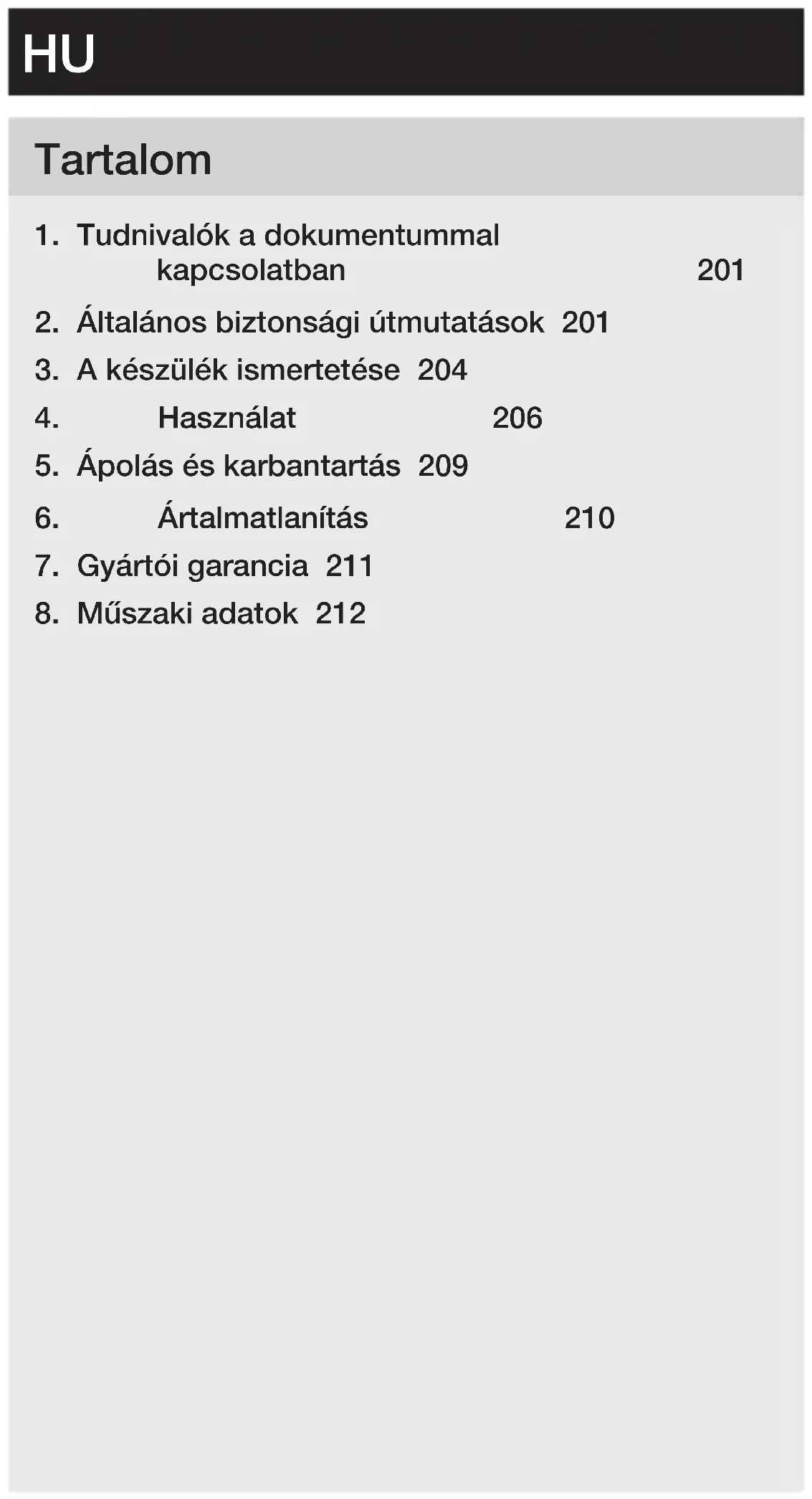 - Ne használja a készüléket nedves állapotban, vagy nedves, illetve vizes környezetben. A készüléket 8 éves és annál idősebb gyermekek, továbbá korlátozott testi, érzékszervi vagy szellemi képességekkel rendelkező, vagy a szükséges tapasztalattal és tudással nem rendelkező személyek csak akkor használhatják, ha valaki felügyeli őket, vagy ismertették velük a készülék biztonságos használatát, és megértették az ezzel járó veszélyeket. Gyermekek nem játszhatnak a készülékkel. A készülék tisztítása és felhasználói karbantartása nem bízható felügyelet nélküli gyermekekre. – Csak eredeti pótalkatrészeket használjon. – Csak eredeti STEINEL rudakat használjon. – A készüléket csak száraz helyiségben használja. – Csak szaküzemek általi javítás megengedett. – Ne hagyja a készüléket felügyelet nélkül.HU – 203 – Tartalom