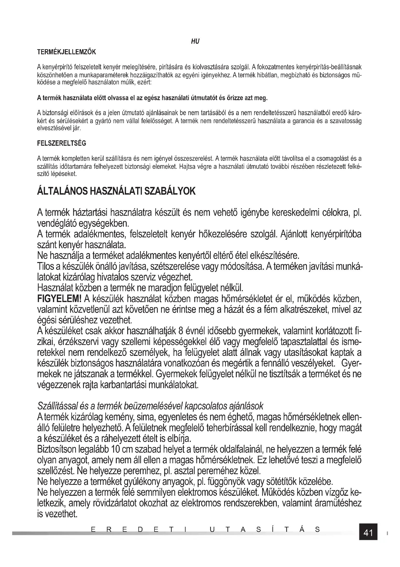 A termék háztartási használatra készült és nem vehető igénybe kereskedelmi célokra, pl. vendéglátó egységekben. A termék adalékmentes, felszeletelt kenyér hőkezelésére szolgál. Ajánlott kenyérpirítóba szánt kenyér használata. Ne használja a terméket adalékmentes kenyértől eltérő étel elkészítésére. Tilos a készülék önálló javítása, szétszerelése vagy módosítása. A terméken javítási munká- latokat kizárólag hivatalos szerviz végezhet. Használat közben a termék ne maradjon felügyelet nélkül. FIGYELEM! A készülék használat közben magas hőmérsékletet ér el, működés közben, valamint közvetlenül azt követően ne érintse meg a házát és a fém alkatrészeket, mivel az égési sérüléshez vezethet. A készüléket csak akkor használhatják 8 évnél idősebb gyermekek, valamint korlátozott fi - zikai, érzékszervi vagy szellemi képességekkel élő vagy megfelelő tapasztalattal és isme- retekkel nem rendelkező személyek, ha felügyelet alatt állnak vagy utasításokat kaptak a készülék biztonságos használatára vonatkozóan és megértik a fennálló veszélyeket. Gyer- mekek ne játszanak a termékkel. Gyermekek felügyelet nélkül ne tisztítsák a terméket és ne végezzenek rajta karbantartási munkálatokat. Szállítással és a termék beüzemelésével kapcsolatos ajánlások A termék kizárólag kemény, sima, egyenletes és nem éghető, magas hőmérsékletnek ellen- álló felületre helyezhető. A felületnek megfelelő teherbírással kell rendelkeznie, hogy magát a készüléket és a ráhelyezett ételt is elbírja. Biztosítson legalább 10 cm szabad helyet a termék oldalfalainál, ne helyezzen a termék felé olyan anyagot, amely nem áll ellen a magas hőmérsékletnek. Ez lehetővé teszi a megfelelő szellőzést. Ne helyezze peremhez, pl. asztal pereméhez közel. Ne helyezze a terméket gyúlékony anyagok, pl. függönyök vagy sötétítők közelébe. Ne helyezzen a termék felé semmilyen elektromos készüléket. Működés közben vízgőz ke- letkezik, amely rövidzárlatot okozhat az elektromos rendszerekben, valamint áramütéshez is vezethet.42
