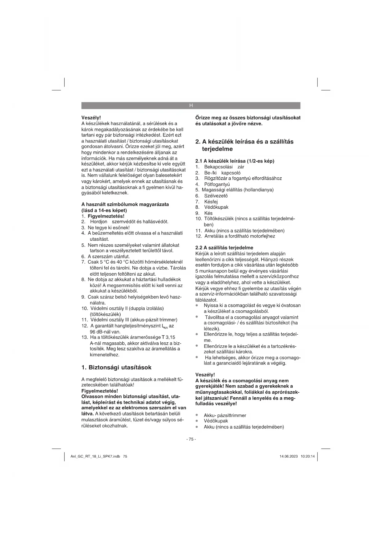 és az akku-csomagot a vevőszolgálatunkhoz beküldeni. Egy szakszerű elküldéséhez kérjük kontaktál- ja a vevőszolgálatunkat vagy az eladó helyet, ahol vásárolta a készüléket. Az akkuk ill. akkus készülékek elküldésénél vagy megsemmisítésénél vegye fi gyelembe, hogy rövidzárlat és tűz elkerüléséhez ezek külön külön legyenek műanyagtasakokban becsomagolva! Az akku-csomag hosszú élettartamának az ér- dekében gondoskodnia kellene az akku-csomag időbeni újboli feltöltéséről. Ez minden esetben akkor szükséges, ha megállapítaná, hogy a készülék teljesítménye alábbhagy. Ne merítse ki sohasem teljesen az akku-csomagot. Ez az akku- csomag defektusához vezet! Anl_GC_RT_18_Li_SPK7.indb 77Anl_GC_RT_18_Li_SPK7.indb 77 14.06.2023 10:20:1414.06.2023 10:20:14H