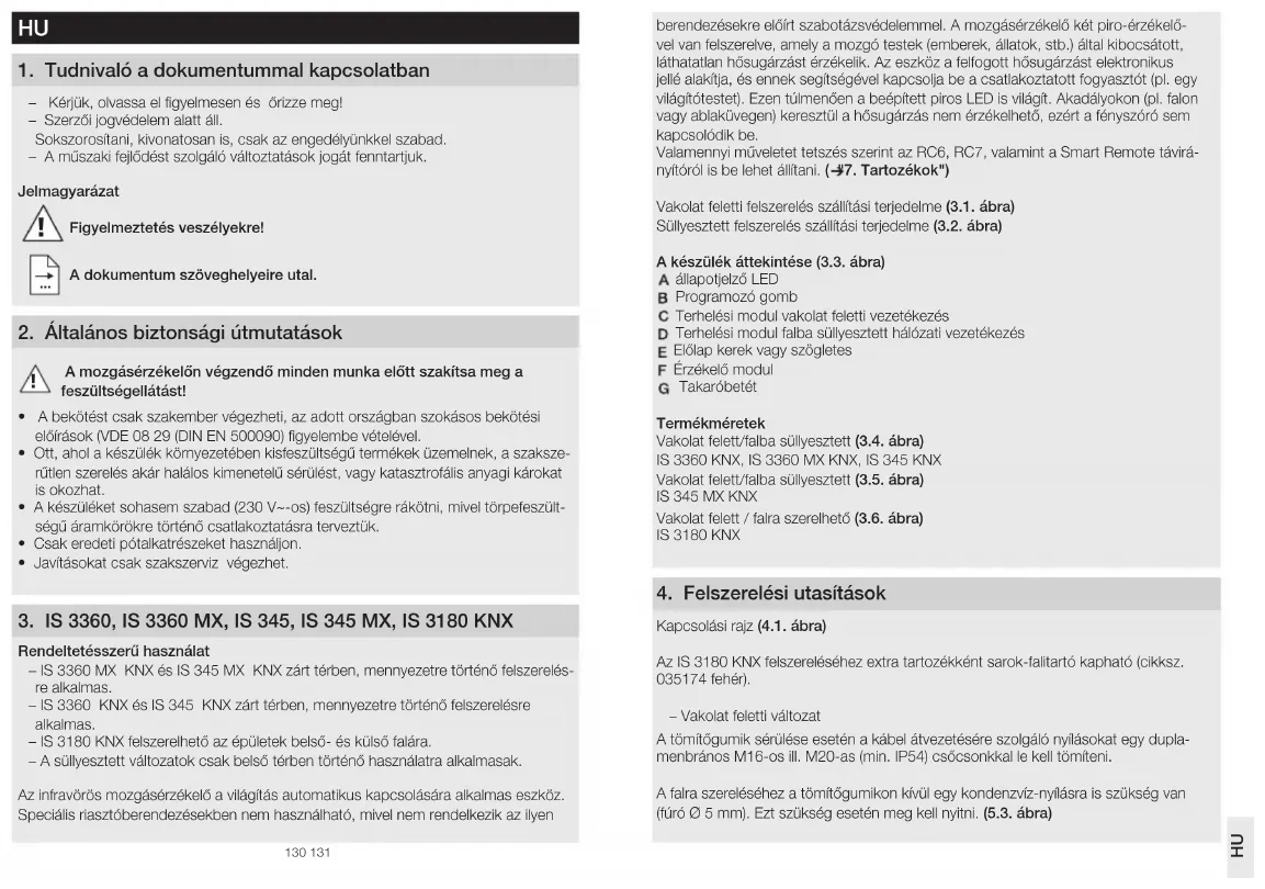 A dokumentum szöveghelyeire utal 2 Általános biztonsági útmutatások A mozgásérzékelőn végzendő minden munka előtt szakítsa meg a feszültségellátást!• A bekötést csak szakember végezheti, az adott országban szokásos bekötési előírások (VDE 08 29 (DIN EN 500090) figyelembe vételével.• Ott, ahol a készülék környezetében kisfeszültségű termékek üzemelnek, a szaksze-rűtlen szerelés akár halálos kimenetelű sérülést, vagy katasztrofális anyagi károkat is okozhat.• A készüléket sohasem szabad (230 V~-os) feszültségre rákötni, mivel törpefeszült-ségű áramkörökre történő csatlakoztatásra terveztük.• Csak eredeti pótalkatrészeket használjon.• Javításokat csak szakszerviz végezhet. 3 IS3360, IS3360 MX, IS345, IS 345 MX, IS3180 KNX Rendeltetésszerű használat – IS3360MX KNX és IS345MX KNX zárt térben, mennyezetre történő felszerelés-re alkalmas. – IS3360 KNX és IS345 KNX zárt térben, mennyezetre történő felszerelésre alkalmas. – IS 3180KNX felszerelhető az épületek belső- és külső falára. – A süllyesztett változatok csak belső térben történő használatra alkalmasak.Az infravörös mozgásérzékelő a világítás automatikus kapcsolására alkalmas eszköz. Speciális riasztóberendezésekben nem használható, mivel nem rendelkezik az ilyen berendezésekre előírt szabotázsvédelemmel. A mozgásérzékelő két piro-érzékelő-vel van felszerelve, amely a mozgó testek (emberek, állatok, stb.) által kibocsátott, láthatatlan hősugárzást érzékelik. Az eszköz a felfogott hősugárzást elektronikus jellé alakítja, és ennek segítségével kapcsolja be a csatlakoztatott fogyasztót (pl. egy világítótestet). Ezen túlmenően a beépített piros LED is világít. Akadályokon (pl. falon vagy ablaküvegen) keresztül a hősugárzás nem érzékelhető, ezért a fényszóró sem kapcsolódik be. Valamennyi műveletet tetszés szerint az RC6, RC7, valamint a Smart Remote távirá-nyítóról is be lehet állítani. ( "7 Tartozékok")Vakolat feletti felszerelés szállítási terjedelme (31 ábra)Süllyesztett felszerelés szállítási terjedelme (32 ábra)A készülék áttekintése (33 ábra) állapotjelző LED Programozó gomb Terhelési modul vakolat feletti vezetékezés Terhelési modul falba süllyesztett hálózati vezetékezés Előlap kerek vagy szögletes Érzékelő modul TakaróbetétTermékméretekVakolat felett/falba süllyesztett (34 ábra) IS3360 KNX, IS3360 MX KNX, IS345KNXVakolat felett/falba süllyesztett (35 ábra) IS345 MXKNXVakolat felett / falra szerelhető (36 ábra) IS3180KNX 4 Felszerelési utasítások Kapcsolási rajz (41 ábra)Az IS3180KNX felszereléséhez extra tartozékként sarok-falitartó kapható (cikksz. 035174 fehér). – Vakolat feletti változatA tömítőgumik sérülése esetén a kábel átvezetésére szolgáló nyílásokat egy dupla-menbrános M16-os ill. M20-as (min. IP54) csőcsonkkal le kell tömíteni.A falra szereléséhez a tömítőgumikon kívül egy kondenzvíz-nyílásra is szükség van (fúró Ø 5mm). Ezt szükség esetén meg kell nyitni. (53 ábra)