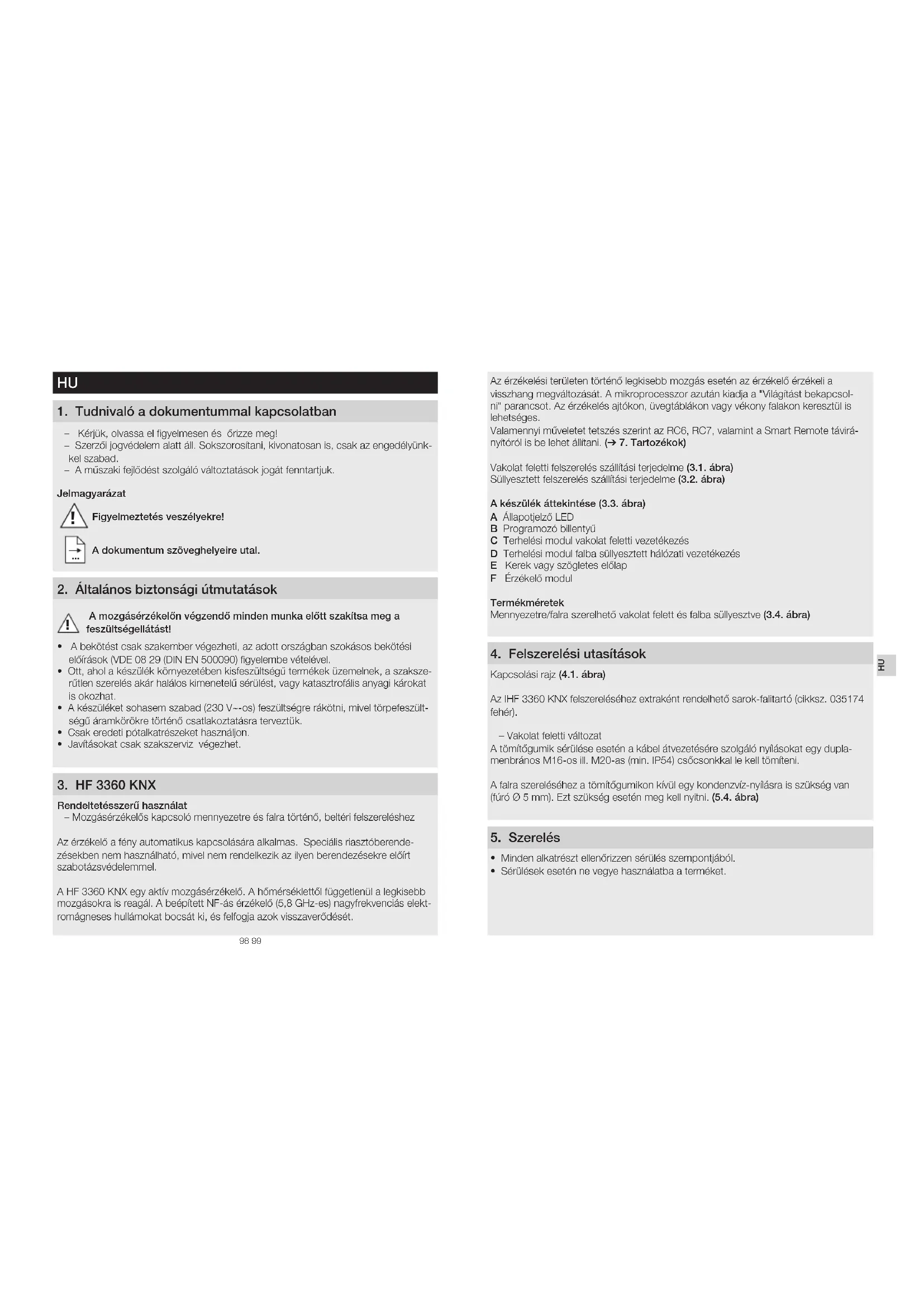 - Javításokat csak szakszerviz végezhet. 3 HF 3360 KNX Rendeltetésszerű használat – Mozgásérzékelős kapcsoló mennyezetre és falra történő, beltéri felszereléshez Az érzékelő a fény automatikus kapcsolására alkalmas. Speciális riasztóberende- zésekben nem használható, mivel nem rendelkezik az ilyen berendezésekre előírt szabotázsvédelemmel. A HF3360KNX egy aktív mozgásérzékelő. A hőmérséklettől függetlenül a legkisebb mozgásokra is reagál. A beépített NF-ás érzékelő (5,8 GHz-es) nagyfrekvenciás elekt- romágneses hullámokat bocsát ki, és felfogja azok visszaverődését.