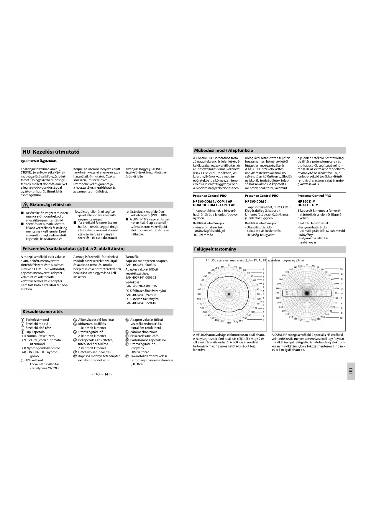 i Hatótávolság-beállítás j Kapcsos mennyezeti adapter, extraként rendelhető k Adapter vakolat fölötti vezetékezéshez, IP 54, extraként rendelhető l Zárómechanizmus m Felszerelés/Bekötés n Párhuzamos kapcsolások o Utánvilágítási idő Irányfény DIM változat p Takarófóliák az érzékelési tartomány minimalizálásához (HF 360). Felszerelés/csatlakoztatás m (ld. a 2. oldali ábrán) A mozgásérzékelő csak vakolat alatti, beltéri, mennyezetre történő felszerelésre alkalmas (kivéve a COM 1 AP-változatot). Kapcsos mennyezeti adapter valamint vakolat fölötti vezetékezéshez való adapter nem található a szállítási terjede- lemben. A mozgásérzékelő- és terhelési modult összeszerelve szállítjuk, és azokat a terhelési modul beépítése és a potméterek/dipek beállítása után egymásba kell illeszteni. Tartozék: Kapcsos mennyezeti adapter, EAN 4007841 000370 Adapter vakolat fölötti vezetékezéshez, EAN 4007841 000363 Védőkosár, EAN 4007841 003036 RC 5 felhasználói távirányító EAN 4007841 592806 RC 8 szerviz-távirányító, EAN 4007841 559410 HU Kezelési útmutató Igen tisztelt Ügyfelünk, Köszönjük bizalmát, amit új, STEINEL jelenlét-érzékelőjének megvásárlásával kifejezésre jut- tatott. Ön egy kiváló minőségű termék mellett döntött, amelyet a legnagyobb gondossággal gyártottunk, próbáltunk ki és csomagoltunk. Kérjük, az üzembe helyezés előtt tanulmányozza át alaposan ezt a használati, útmutatót. Csak a szakszerű felszerelés és üzembehelyezés garantálja a hosszú távú, megbízható és zavarmentes működést. Kívánjuk, hogy új STEINEL érzékelőjének használatában örömét lelje. Biztonsági előírások Működési mód / Alapfunkció A Control PRO sorozathoz tarto- zó nagyfrekvenciás jelenlét-érzé- kelők szabályozzák a világítást és a fűtés/szellőzés/klíma-vezérlést (csak COM 2) pl. irodákban, WC- kben, nyilvános vagy magán- épületekben, a környezeti fény- erő és a jelenlét függvényében. A modern nagyfrekvenciás tech- nológiával biztosított a teljesen hézagmentes, hőmérséklettől független mozgásérzékelés. A DUAL HF érzékelő kettős iránykarakterisztikákának kö- szönhetően különösen szállodák és iskolák, irodaépületek folyo- sóihoz alkalmas. A kapcsolt ki- menetek beállításai, valamint a jelenlét-érzékelő hatótávolság- beállítása potenciométerek és dip-kapcsolók segítségével tör- ténik, ill. az extraként rendelhető távirányító használatával. A je- lenlét-érzékelő továbbá kitűnik rendkívül alacsony saját áramfo- gyasztásával is. Presence Control PRO