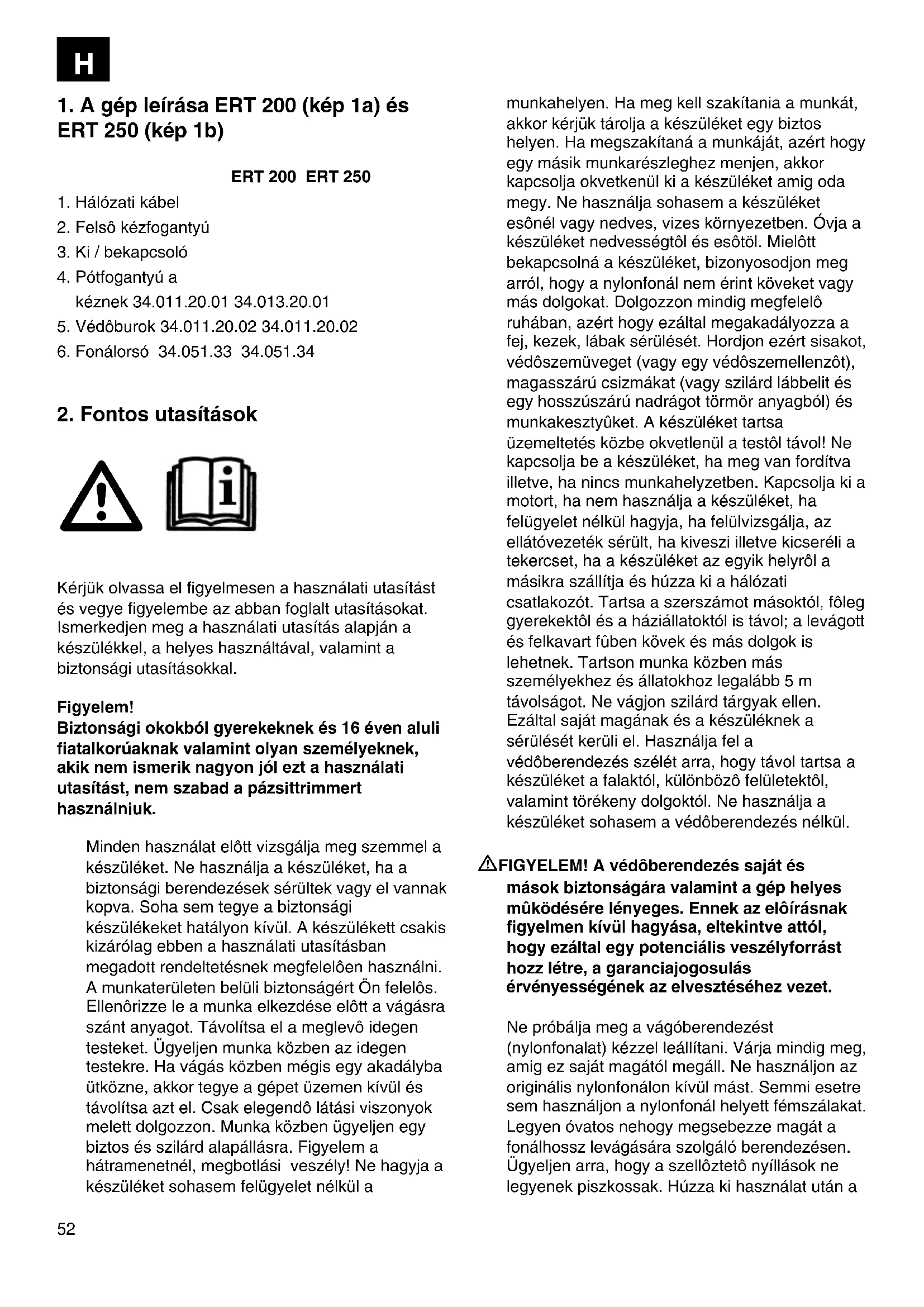 Kérjük olvassa el figyelmesen a használati utasítást és vegye figyelembe az abban foglalt utasításokat. Ismerkedjen meg a használati utasítás alapján a készülékkel, a helyes használtával, valamint a biztonsági utasításokkal. Figyelem! Biztonsági okokból gyerekeknek és 16 éven aluli fiatalkorúaknak valamint olyan személyeknek, akik nem ismerik nagyon jól ezt a használati utasítást, nem szabad a pázsittrimmert használniuk. Minden használat elôtt vizsgálja meg szemmel a készüléket. Ne használja a készüléket, ha a biztonsági berendezések sérültek vagy el vannak kopva. Soha sem tegye a biztonsági készülékeket hatályon kívül. A készülékett csakis kizárólag ebben a használati utasításban megadott rendeltetésnek megfelelôen használni. A munkaterületen belüli biztonságért Ön felelôs. Ellenôrizze le a munka elkezdése elôtt a vágásra szánt anyagot. Távolítsa el a meglevô idegen testeket. Ügyeljen munka közben az idegen testekre. Ha vágás közben mégis egy akadályba ütközne, akkor tegye a gépet üzemen kívül és távolítsa azt el. Csak elegendô látási viszonyok melett dolgozzon. Munka közben ügyeljen egy biztos és szilárd alapállásra. Figyelem a hátramenetnél, megbotlási veszély! Ne hagyja a készüléket sohasem felügyelet nélkül a munkahelyen. Ha meg kell szakítania a munkát, akkor kérjük tárolja a készüléket egy biztos helyen. Ha megszakítaná a munkáját, azért hogy egy másik munkarészleghez menjen, akkor kapcsolja okvetkenül ki a készüléket amig oda megy. Ne használja sohasem a készüléket esônél vagy nedves, vizes környezetben. Óvja a készüléket nedvességtôl és esôtöl. Mielôtt bekapcsolná a készüléket, bizonyosodjon meg arról, hogy a nylonfonál nem érint köveket vagy más dolgokat. Dolgozzon mindig megfelelô ruhában, azért hogy ezáltal megakadályozza a fej, kezek, lábak sérülését. Hordjon ezért sisakot, védôszemüveget (vagy egy védôszemellenzôt), magasszárú csizmákat (vagy szilárd lábbelit és egy hosszúszárú nadrágot törmör anyagból) és munkakesztyûket. A készüléket tartsa üzemeltetés közbe okvetlenül a testôl távol! Ne kapcsolja be a készüléket, ha meg van fordítva illetve, ha nincs munkahelyzetben. Kapcsolja ki a motort, ha nem használja a készüléket, ha felügyelet nélkül hagyja, ha felülvizsgálja, az ellátóvezeték sérült, ha kiveszi illetve kicseréli a tekercset, ha a készüléket az egyik helyrôl a másikra szállítja és húzza ki a hálózati csatlakozót. Tartsa a szerszámot másoktól, fôleg gyerekektôl és a háziállatoktól is távol; a levágott és felkavart fûben kövek és más dolgok is lehetnek. Tartson munka közben más személyekhez és állatokhoz legalább 5 m távolságot. Ne vágjon szilárd tárgyak ellen. Ezáltal saját magának és a készüléknek a sérülését kerüli el. Használja fel a védôberendezés szélét arra, hogy távol tartsa a készüléket a falaktól, különbözô felületektôl, valamint törékeny dolgoktól. Ne használja a készüléket sohasem a védôberendezés nélkül. FIGYELEM! A védôberendezés saját és mások biztonságára valamint a gép helyes mûködésére lényeges. Ennek az elôírásnak figyelmen kívül hagyása, eltekintve attól, hogy ezáltal egy potenciális veszélyforrást hozz létre, a garanciajogosulás érvényességének az elvesztéséhez vezet. Ne próbálja meg a vágóberendezést (nylonfonalat) kézzel leállítani. Várja mindig meg, amig ez saját magától megáll. Ne használjon az originális nylonfonálon kívül mást. Semmi esetre sem használjon a nylonfonál helyett fémszálakat. Legyen óvatos nehogy megsebezze magát a fonálhossz levágására szolgáló berendezésen. Ügyeljen arra, hogy a szellôztetô nyíllások ne legyenek piszkossak. Húzza ki használat után a H53 hálózati csatlakozót és vizsgálja meg a gépet sérülésekre. Ne próbáljon a készülékkel olyan füveket vágni amelyek nem a talajon nônek; például ne próbálja meg, olyan füveknek a vágását amelyek falakon vagy köveken stb. nônek. A pázsittrimmer munkaterületén belül harmadikkal szembeni károkért, amelyek a szerszám használat által keletkeznek, a használó felelôs. Ne menjen bekapcsolt készülékkel útcán vagy kavicsos úton át. Ha nem használja a készüléket, akkor tárolja egy száraz és a gyerekek számára elérhetetlen helyen. A készüléket csak a használati utasításban leírottak szerint használni és a talajhoz mindig függôlegessen tartani. Minden más féle tartás veszélyes. Vizsgálja rendszeressen felül, hogy a csavarok rendessen meg vannak e húzva. A hálózati feszültségnek meg kell egyeznie az adattáblán megadott feszültséggel. A csatlakozóvezetéket, sérülési vagy öregedési jelekre, rendszeressen felül kell vizsgálni. A készüléket nem szabad használni, ha a csatlakozóvezeték állapota nem kifogástalan. A felhasznált csatlakozóvezetékeknek nem szabad a HO7RN-F a DIN 57282/VDE 0282 szerinti könnyû gumitömlôvezetékektôl könnyebbnek lenniük és legalább 1,5 mm2 -es átmérôjûnek kell lenniük. A dugós csatlakozóknak védôérintkezôsöknek és a csatlakoztatásnak fröccsenôvíz védetnek kell lennie. A vágásra elôrelátott felületet a kábeltôl és más tárgyaktól mindig szabadon tartani. Ha a szállításhoz fel kell emelni a készüléket, akkor ki kell kapcsolni a motort és meg kell várni amig a szerszám nyugalmi állapotban nincs. A készülék elhagyása elôtt nyugalomba kell helyezni a motort és ki kell húzni a hálózati csatlakozót. Mielôtt rákapcsolná a készüléket az áramhálózatra, bizonyosodjon meg arról, hogy a forgó egységek közül egyik sincs megsérülve és a fonálgombolyag rendessen be van téve és oda van erôsítve. Az üzemeltetés ideje alatt semmi esetre sem sz