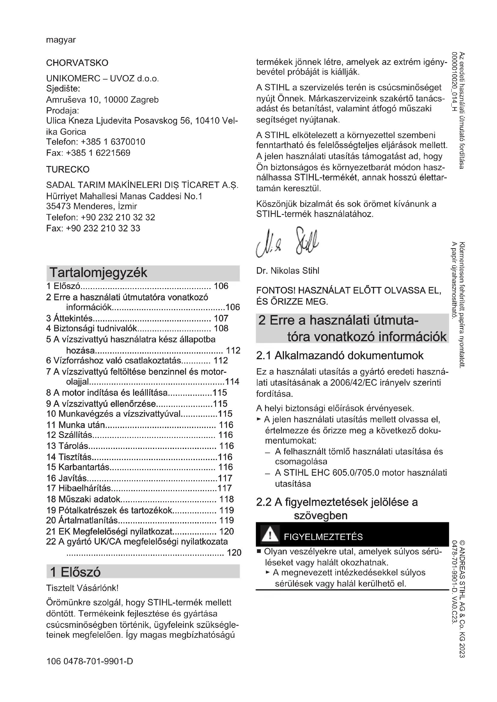 szövegben FIGYELMEZTETÉS ■ Olyan veszélyekre utal, amelyek súlyos sérü‐ léseket vagy halált okozhatnak. ► A megnevezett intézkedésekkel súlyos sérülések vagy halál kerülhető el. magyar 106 0478-701-9901-D © ANDREAS STIHL AG & Co. KG 2023 0478-701-9901-D. VA0.C23. Klórmentesen fehérített papírra nyomtatott. A papír újrahasznosítható. Az eredeti használati útmutató fordítása 0000010020_014_HTUDNIVALÓ ■ Olyan veszélyekre utal, amelyek anyagi káro‐ kat okozhatnak. ► A megnevezett intézkedésekkel anyagi károk kerülhetők el.