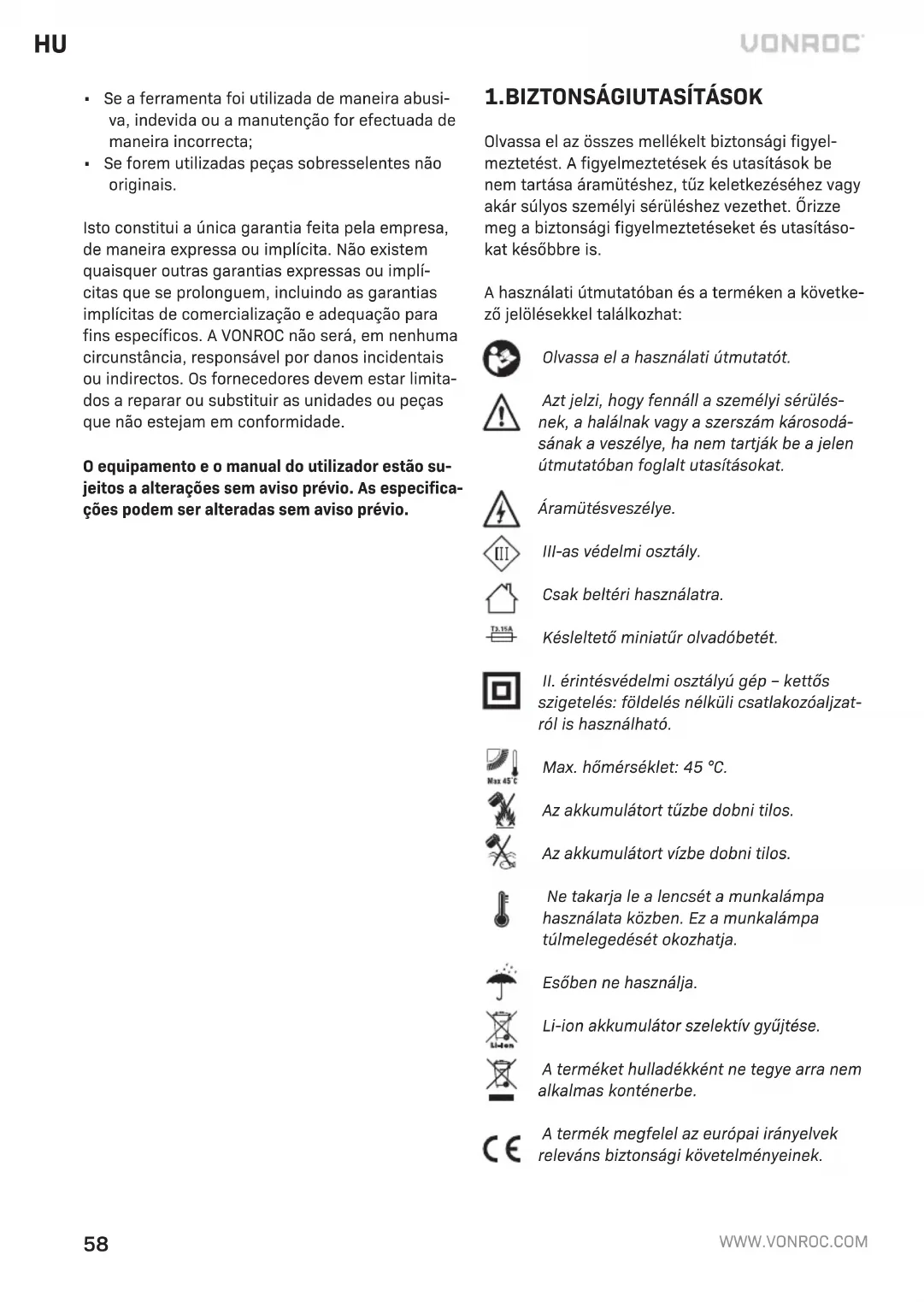 a) Ne bontsa szét az akkumulátort. Rövidzárlat veszélye. b) Hőbehatástól védje az akkumulátort, pl. ne te- gye ki folyamatos erős napsugárzásnak, tűztől, víztől és más nedvességtől is védje. Robbanás- veszély. c) Ha az akkumulátor sérült, vagy rendellenesen használják, gőzök áramolhatnak belőle. Szel- lőztesse át amunkaterületet, és ha egészségi panaszai vannak, kérjen orvosi segítséget. Agőzök irritálhatják alégutakat. d) Az akkumulátort csak aVonroc termékéhez használja. Ezzel az intézkedéssel veszélyes túlterheléstől védi az akkumulátorát.