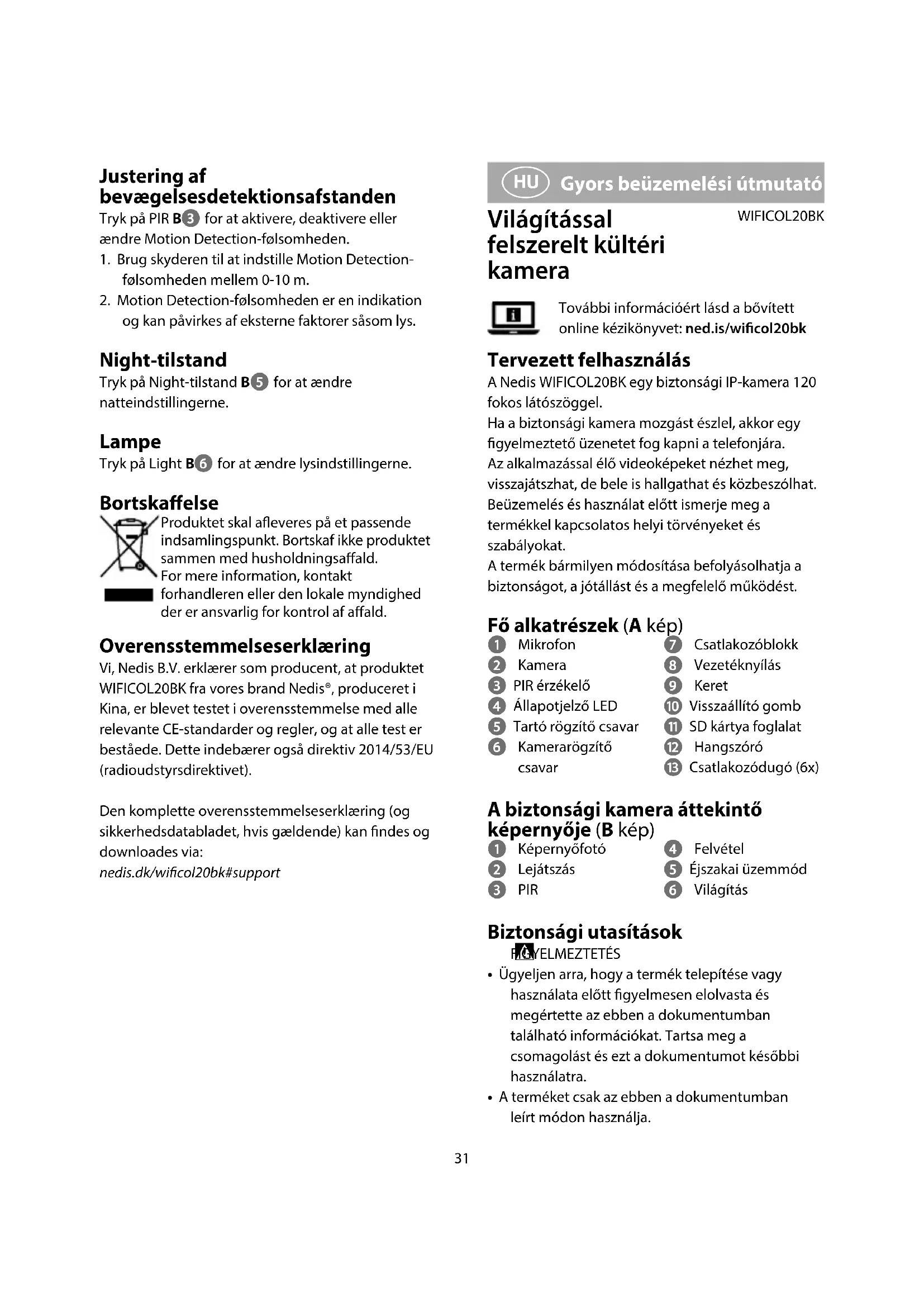 Gyors beüzemelési útmutató Világítással felszerelt kültéri kamera WIFICOL20BKTovábbi információért lásd a bővített online kézikönyvet: ned.is/wicol20bk Tervezett felhasználás A Nedis WIFICOL20BK egy biztonsági IP-kamera 120 fokos látószöggel.Ha a biztonsági kamera mozgást észlel, akkor egy gyelmeztető üzenetet fog kapni a telefonjára.Az alkalmazással élő videoképeket nézhet meg, visszajátszhat, de bele is hallgathat és közbeszólhat.Beüzemelés és használat előtt ismerje meg a termékkel kapcsolatos helyi törvényeket és szabályokat.A termék bármilyen módosítása befolyásolhatja a biztonságot, a jótállást és a megfelelő működést. Fő alkatrészek (A kép) 1 Mikrofon 2 Kamera 3 PIR érzékelő 4 Állapotjelző LED 5 Tartó rögzítő csavar 6 Kamerarögzítő csavar 7 Csatlakozóblokk 8 Vezetéknyílás 9 Keret q Visszaállító gomb w SD kártya foglalat e Hangszóró r Csatlakozódugó (6x) A biztonsági kamera áttekintő képernyője (B kép) 1 Képernyőfotó 2 Lejátszás 3 PIR 4 Felvétel 5 Éjszakai üzemmód 6 Világítás Biztonsági utasítások