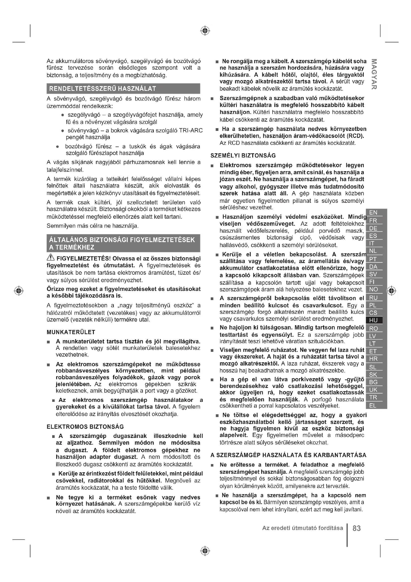 ■ Használat előtt és amennyiben a gépet bármilyen behatás éri, ellenőrizze, hogy az alkatrészek nem sérültek. A hibás kapcsolókat vagy bármilyen más sérült vagy elhasználódott alkatrészt egy hivatalos szervizközpontban megfelelően meg kell javíttatni vagy ki kell cseréltetni. ■ A biztonsági védőburkolatra szerelt kis kés vágja le az újonnan kihúzott szálat a megfelelő hosszra a biztonságos és az optimális teljesítményért. A kés nagyon éles. Ne nyúljon a késhez, különösen a termék tisztításakor ne. ■ Csere esetén csak a gyártó által előírt csereszálat használja. Ne használjon semmilyen más vágó szerelvényt. ■ Bizonyosodjon meg róla, hogy a vágószerelék helyesen lett felszerelve és biztonságosan rögzítve van. ■ Soha ne működtesse a terméket, amíg nincs minden védőburkolat, terelőlemez és fogantyú megfelelően felszerelve és rögzítve. ■ Minden használat előtt gondoskodjon arról, hogy a biztonsági védőburkolatban lévő vágókés megfelelően legyen elhelyezve és rögzítve. ■ Tartsa a vágófejet a derék szintje alatt. ■ Baleset vagy üzemzavar esetén azonnal kapcsolja ki és vegye ki az akkumulátort. Ne használja a készüléket, amíg teljesen ét nem vizsgálták egy hivatalos szervizközpont ■ A mozgó alkatrészek megérintése miatt keletkező sérülés kockázatának csökkentésére minden esetben állítsa le a terméket, vegye ki az akkumulátort és hagyja mindkettőt lehűlni. Ellenőrizze, hogy minden mozgó rész teljesen megállt: ● szervizelés előtt ● az eltömődés eltávolítása előtt ● ellenőrzés, karbantartás vagy a gépen végzett bármilyen művelet megkezdése előtt; ● kiegészítők cseréje előtt ● idegen objektum eltávolítása után ● a termék felügyelet nélkül hagyása esetén ● karbantartás végzésekor ● ha a gép szokatlanul kezd rezegni86 Az eredeti útmutató fordítása ■ Ügyeljen rá, hogy az összes védőburkolat és fogantyú megfelelően felszerelt és jó állapotú legyen. ■ A terméket az arra szolgáló fogantyúknál tartsa, és korlátozza a munkaidőt és a vibrációnak való kitettséget. ■ Ügyeljen a vágóeszköz által kivetett tárgyakra. Használat előtt tisztítsa meg a munkaterületet az olyan törmelékektől, mint a kis kövek, kavicsok és egyéb idegen tárgyak. A drótok és a vágószál beakadhatnak a vágóeszközbe. ■ A termék hevederrel rendelkezik. Használja a hevedert a termék működtetése közben. A hevedert gondosan állítsa be, hogy kényelmes legyen, és a terméket a jobb oldalán tartsa. Keresse meg a gyorskioldó mechanizmust, és gyakorolja be a használatát, mielőtt elkezdené használni a gépet. A helyes használat megakadályozhatja a súlyos sérüléseket vészhelyzetben. Soha ne vegyen fel további ruházatot a hevederre, és más módon se korlátozza a hozzáférést a gyorskioldó szerkezethez. ■ Ne viseljen több övet vagy vállhevedert. ■ Mindig ügyeljen rá, hogy semmi ne maradjon a szellőzőnyílásokban. ■ Csak 0 °C és 40 °C közötti homérsékleten használja a készüléket. ■ A készüléket 0 °C és 40 °C közötti homérsékleten tárolja. ■ A kések felhelyezésekor és leszerelésekor használjon erős védőkesztyűt, a kések élesek. ■ Ne próbálja forgás közben megérinteni vagy megállítani a kést. ■ A sérült késeket cserélje ki. Használat előtt mindig ellenőrizze, hogy a vágókés megfelelően fel van szerelve és erősen rögzítve van. ■ Ha a tárcsát cserélni kell, akkor újakat csak a gyártótól rendeljen. Ne használjon semmilyen más vágó szerelvényt. ■ A TRI-ARC vágótárcsa esetében soha ne vágjon 13 mm átmérő feletti anyagot. ■ Soha ne vágjon 40 mm-nél nagyobb átmérőjű anyagot a fűrészlappal. Ügyeljen a leeső ágakra a fűrészlap használatakor. ■ A termék tárolása vagy szállítása előtt fedje be a kést a vágótárcsa-védőlappal. Mindig távolítsa el a késvédő burkolatot a szerszám használata előtt. Ha nincs eltávolítva a késvédő burkolat, akkor kivetődhet, amint a kés elkezd forogni. ■ Az akkumulátor telepítésekor vagy cseréjekor fektesse a terméket a földre úgy, hogy a penge felfelé nézzen, ne érjen a talajhoz, és meghosszabbítsa a penge élettartamát. ■ A könnyű és biztonságos vágás érdekében, jobbról balra mozogva közelítse meg a vágandó gazt. Abban az esetben, ha hirtelen egy tárggyal vagy fadarabbal találkozik, ezzel minimalizálhatja a kés kilökődésének reakcióját. Mindig mindkét kezét használja a termék irányításához. ■ Hosszabb használat sérülést okozhat. Ha a terméket hosszabb ideig használja, ügyeljen arra, hogy rendszeresen tartson szünetet. AZ AKKUMULÁTOR KIEGÉSZÍTŐ BIZTONSÁGI FIGYELMEZTETÉSEI ■ A rövidzárlat általi tűz, sérülések vagy termékkárosodások veszélye elkerülésére ne merítse a szerszámot, a cserélhető akkut vagy a töltőkészüléket folyadékokba, és gondoskodjon arról, hogy ne hatoljanak folyadékok a készülékekbe és az akkukba. A korrozív hatású vagy vezetőképes folyadékok, mint pl. a sós víz, bizonyos vegyi anyagok, fehérítők vagy fehérítő tartalmú termékek, rövidzárlatot okozhatnak. ■ Olyan helyen töltse az akkumulátort, ahol a környezeti homérséklet 10 °C és 38 °C között van. ■ Az akkumulátort 0 °C és 20°C közötti homérsékleten tárolja. ■ Az akkumulátort 0 °C és 40 °C közötti homérsékleten használja. SZÁLLÍTÁS ÉS TÁROLÁS ■ Tárolás vagy szállítás előtt kapcsolja ki a terméket, vegye ki az akkucsomagot és hagyja kihűlni. ■ Minden idegen anyagtól tisztítsa meg a terméket. ■ Ne tárolja vagy szállítsa a terméket beszerelt akkumulátorral. Vegye ki az akkumulátort, és rögzítse külön. Hűvös, száraz és jól szellőztetett, gyerekek