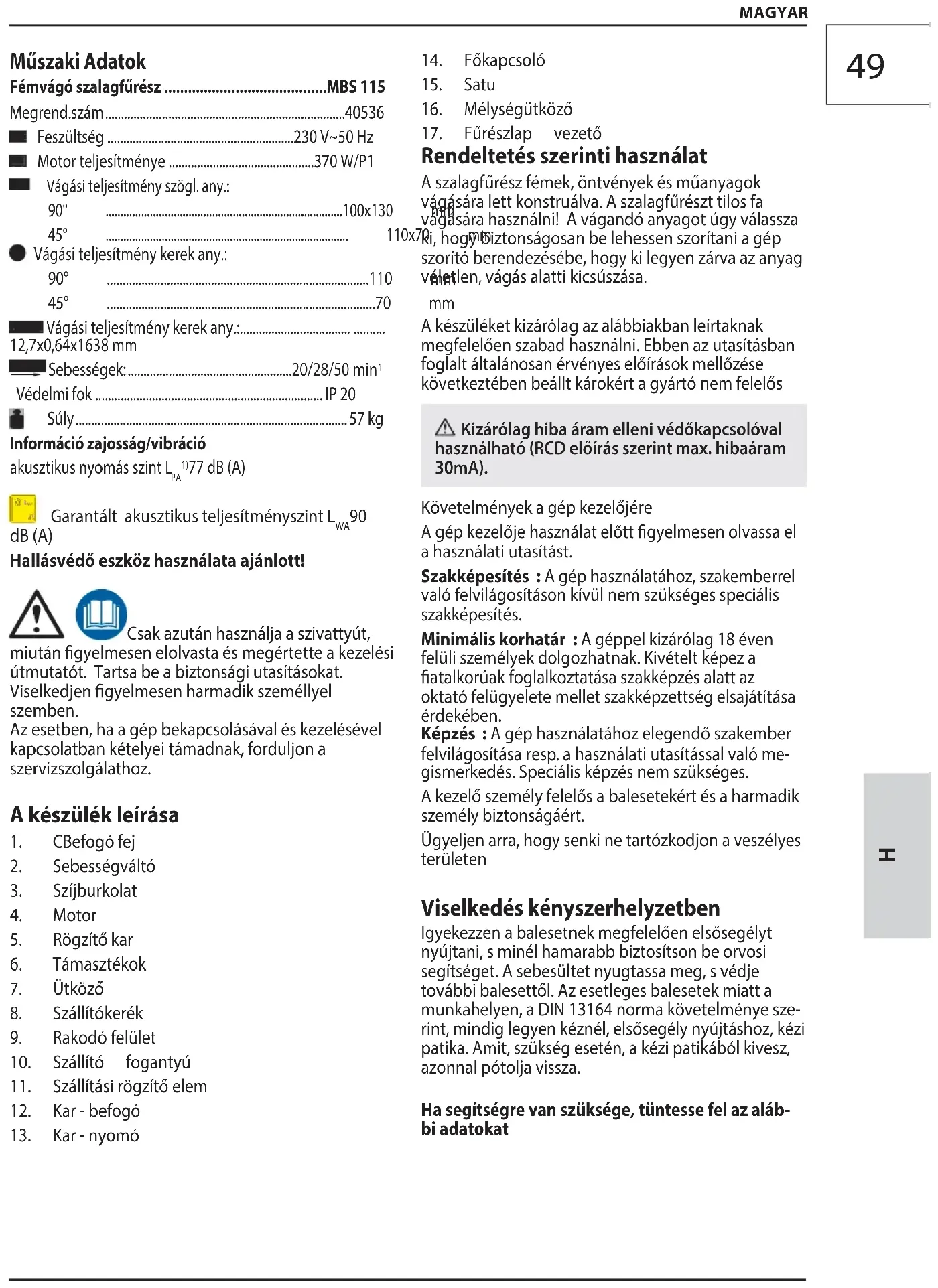Rendeltetés szerinti használat A szalagfűrész fémek, öntvények és műanyagok vágására lett konstruálva. A szalagfűrészt tilos fa vágására használni! A vágandó anyagot úgy válassza ki, hogy biztonságosan be lehessen szorítani a gép szorító berendezésébe, hogy ki legyen zárva az anyag véletlen, vágás alatti kicsúszása. A készüléket kizárólag az alábbiakban leírtaknak megfelelően szabad használni. Ebben az utasításban foglalt általánosan érvényes előírások mellőzése következtében beállt károkért a gyártó nem felelős Kizárólag hiba áram elleni védőkapcsolóval használható (RCD előírás szerint max. hibaáram 30mA). Követelmények a gép kezelőjére A gép kezelője használat előtt gyelmesen olvassa el ahasználati utasítást. Szakképesítés : A gép használatához, szakemberrel valófelvilágosításon kívül nem szükséges speciális szakképesítés. Minimális korhatár : A géppel kizárólag 18 éven felüliszemélyek dolgozhatnak. Kivételt képez a atalkorúakfoglalkoztatása szakképzés alatt az oktató felügyelete melletszakképzettség elsajátítása érdekében. Képzés : A gép használatához elegendő szakember felvilágosításaresp . a használati utasítással való me- gismerkedés. Speciálisképzés nem szükséges. A kezelő személy felelős a balesetekért és a harmadik személy biztonságáért. Ügyeljen arra, hogy senki ne tartózkodjon a veszélyes területen Viselkedés kényszerhelyzetben Igyekezzen a balesetnek megfelelően elsősegélyt nyújtani,s minél hamarabb biztosítson be orvosi segítséget. Asebesültet nyugtassa meg, s védje további balesettől.Az esetleges balesetek miatt a munkahelyen, a DIN 13164norma követelménye sze- rint, mindig legyen kéznél,elsősegély nyújtáshoz, kézi patika. Amit, szükség esetén,a kézi patikából kivesz, azonnal pótolja vissza. Ha segítségre van szüksége, tüntesse fel az aláb- biadatokat Műszaki Adatok Fémvágó szalagfűrész .........................................MBS 115 Megrend.szám ............................................................................40536 Feszültség ...........................................................230 V~50 Hz Motor teljesítménye ..............................................370 W/P1 Vágási teljesítmény szögl. any.: 90° ................................................................................100x130 mm 45° .................................................................................. 110x70 mm Vágási teljesítmény kerek any.: 90° ...................................................................................110 mm 45° .....................................................................................70 mm Vágási teljesítmény kerek any.:................................... .......... 12,7x0,64x1638 mm Sebességek: ....................................................20/28/50 min