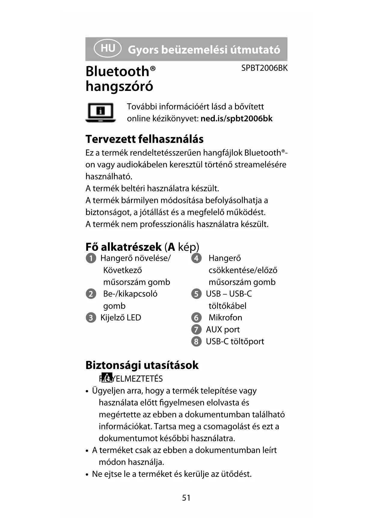 Gyors beüzemelési útmutató Bluetooth® hangszóró SPBT2006BKTovábbi információért lásd a bővített online kézikönyvet: ned.is/spbt2006bk Tervezett felhasználás Ez a termék rendeltetésszerűen hangfájlok Bluetooth®-on vagy audiokábelen keresztül történő streamelésére használható.A termék beltéri használatra készült.A termék bármilyen módosítása befolyásolhatja a biztonságot, a jótállást és a megfelelő működést.A termék nem professzionális használatra készült. Fő alkatrészek (A kép) 1 Hangerő növelése/ Következő műsorszám gomb 2 Be-/kikapcsoló gomb 3 Kijelző LED 4 Hangerő csökkentése/előző műsorszám gomb 5 USB – USB-C töltőkábel 6 Mikrofon 7 AUX port 8 USB-C töltőport Biztonsági utasítások