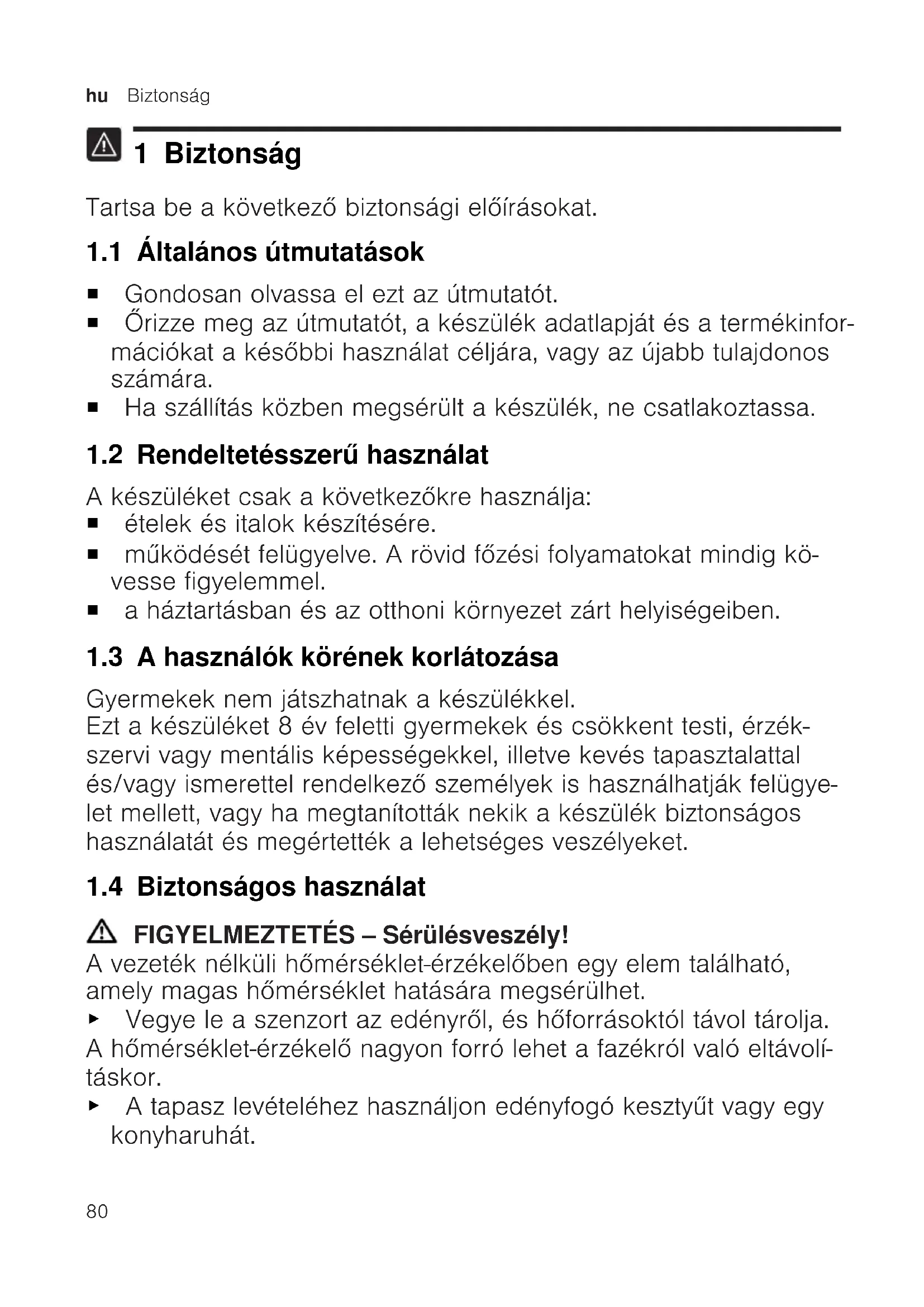 1 Biztonság Tartsa be a következő biztonsági előírásokat. 1.1 Általános útmutatások ¡ Gondosan olvassa el ezt az útmutatót. ¡ Őrizze meg az útmutatót, a készülék adatlapját és a termékinfor- mációkat a későbbi használat céljára, vagy az újabb tulajdonos számára. ¡ Ha szállítás közben megsérült a készülék, ne csatlakoztassa. 1.2 Rendeltetésszerű használat A készüléket csak a következőkre használja: ¡ ételek és italok készítésére. ¡ működését felügyelve. A rövid főzési folyamatokat mindig kö- vesse figyelemmel. ¡ a háztartásban és az otthoni környezet zárt helyiségeiben. 1.3 A használók körének korlátozása Gyermekek nem játszhatnak a készülékkel. Ezt a készüléket 8év feletti gyermekek és csökkent testi, érzék- szervi vagy mentális képességekkel, illetve kevés tapasztalattal és/vagy ismerettel rendelkező személyek is használhatják felügye- let mellett, vagy ha megtanították nekik a készülék biztonságos használatát és megértették a lehetséges veszélyeket. 1.4 Biztonságos használat FIGYELMEZTETÉS‒Sérülésveszély! A vezeték nélküli hőmérséklet-érzékelőben egy elem található, amely magas hőmérséklet hatására megsérülhet. ▶ Vegye le a szenzort az edényről, és hőforrásoktól távol tárolja. A hőmérséklet-érzékelő nagyon forró lehet a fazékról való eltávolí- táskor. ▶ A tapasz levételéhez használjon edényfogó kesztyűt vagy egy konyharuhát.Biztonság hu