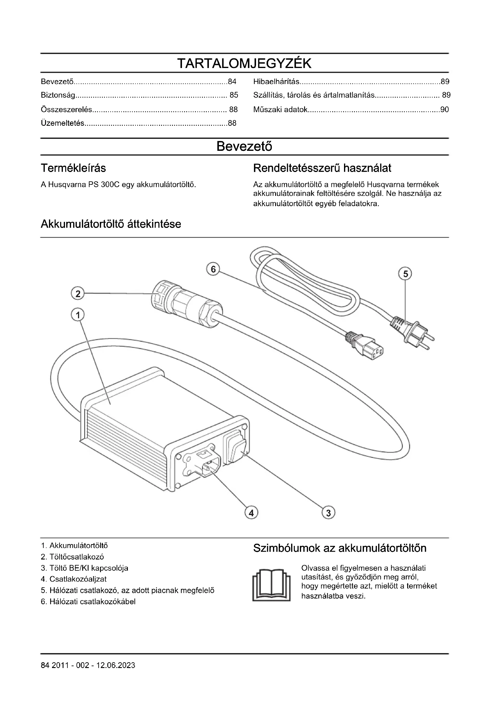 - Műszaki adatok Bevezető Termékleírás A Husqvarna PS 300C egy akkumulátortöltő. Rendeltetésszerű használat Az akkumulátortöltő a megfelelő Husqvarna termékek akkumulátorainak feltöltésére szolgál. Ne használja az akkumulátortöltőt egyéb feladatokra. Akkumulátortöltő áttekintése p. 90